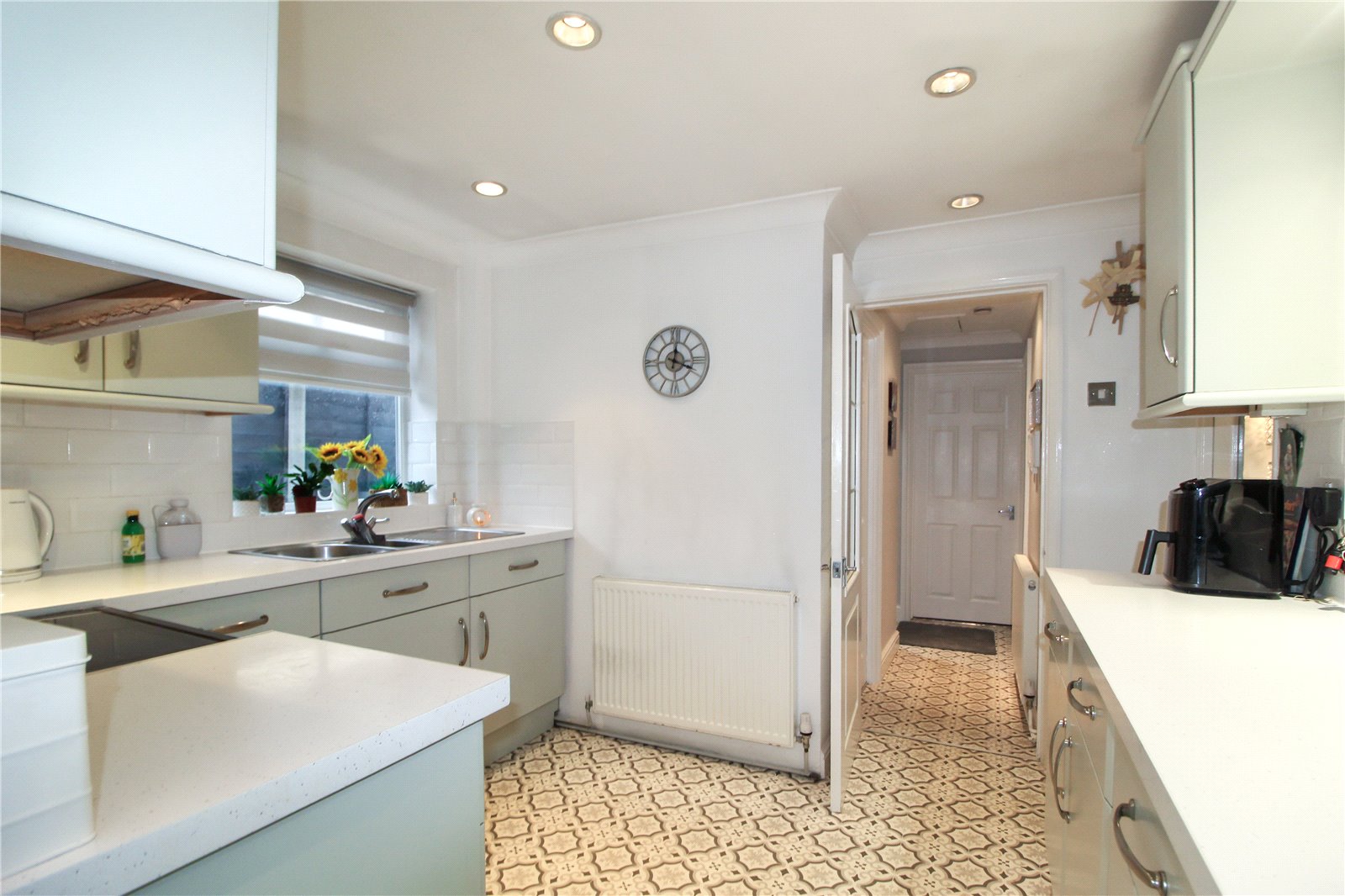 uPVC double glazed window to side. Fitted with a worksurface comprising inset bowl and a quarter stainless steel sink and drainer unit with chrome mixer tap, a range of base and eye-level cabinets with a further fitted worksurface with a range of base and eye-level cabinets set with recessed spotlights. Brick slip tiled splashback to all worksurfaces. Space for cooker with extractor hood above. Tile-effect vinyl flooring. Skirting. Radiator. Chrome light switch. Smooth plastered walls. Coving to smooth plastered ceiling with recessed LED spotlights. Door and service opening into Living Room. Archway into Conservatory.