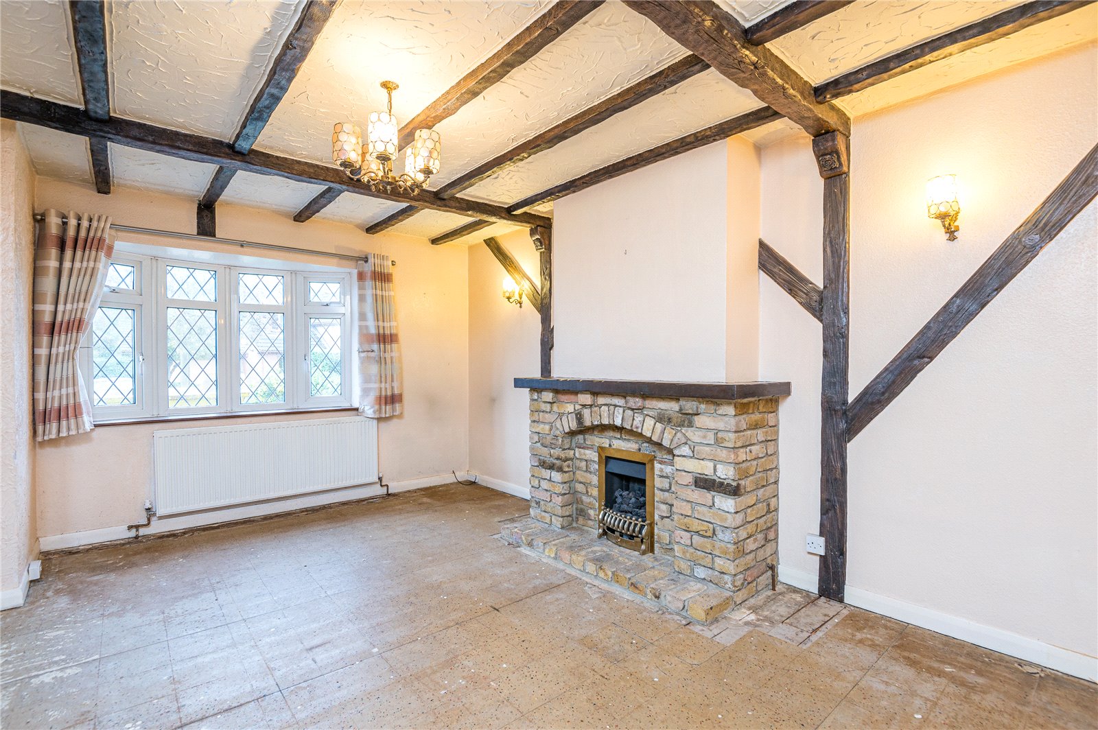 Double glazed leadlight bow window to front. Feature redbrick fireplace with inset coal effect living flame gas fire (untested). Radiator. Two wall light points. Ornamental exposed beams and studwork.