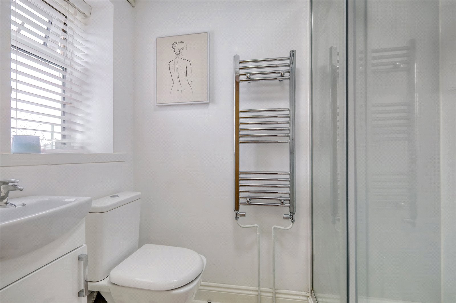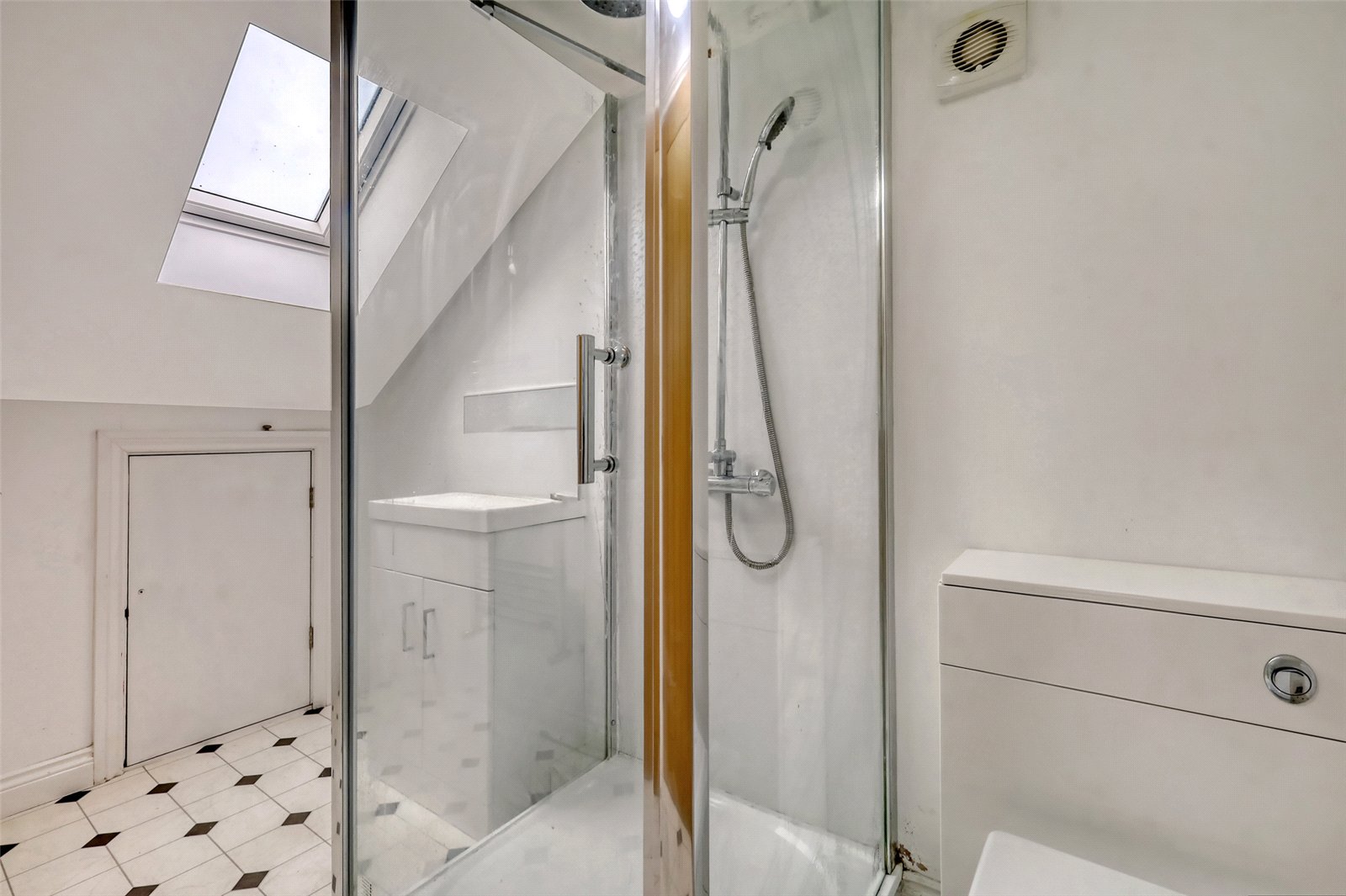 Double glazed Velux window to front. Vinyl cushion flooring. Lipped skirting. Fitted with a three piece suite comprising independent glazed shower cubicle with hand held and rainwater shower fittings, integrated cistern dual flush w.c. and vanity wash hand basin. Marblite panelling to wet areas. Chrome heated towel rail. Access to large eaves storage space. Smooth plastered ceiling.