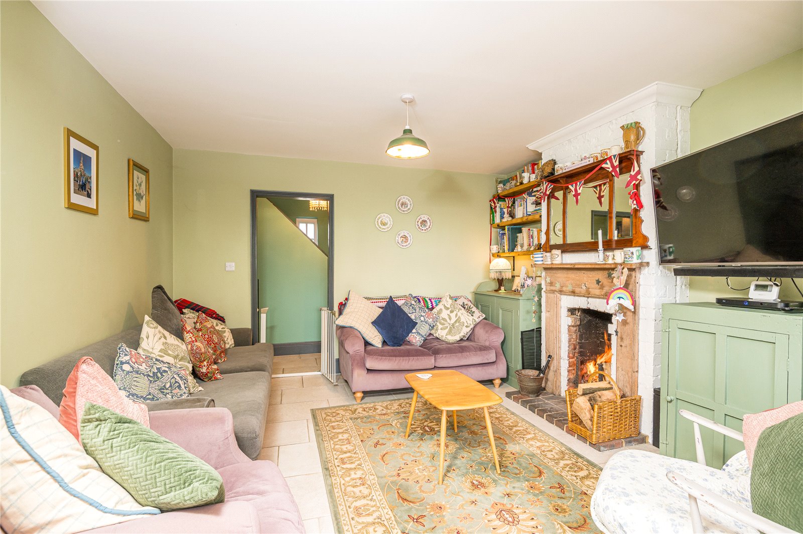 Flagstone effect porcelain tiled floor, lipped skirting. Old school radiator. Access to under stairs storage cupboard. Staircase to first floor part galleried landing. Smooth plastered ceiling. Shaker style doors lead off to: