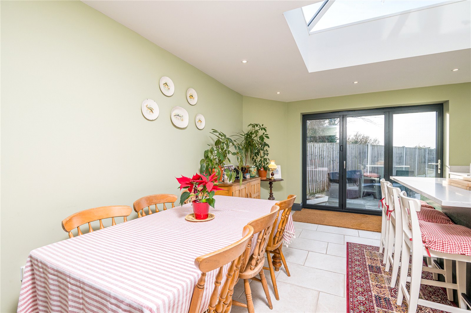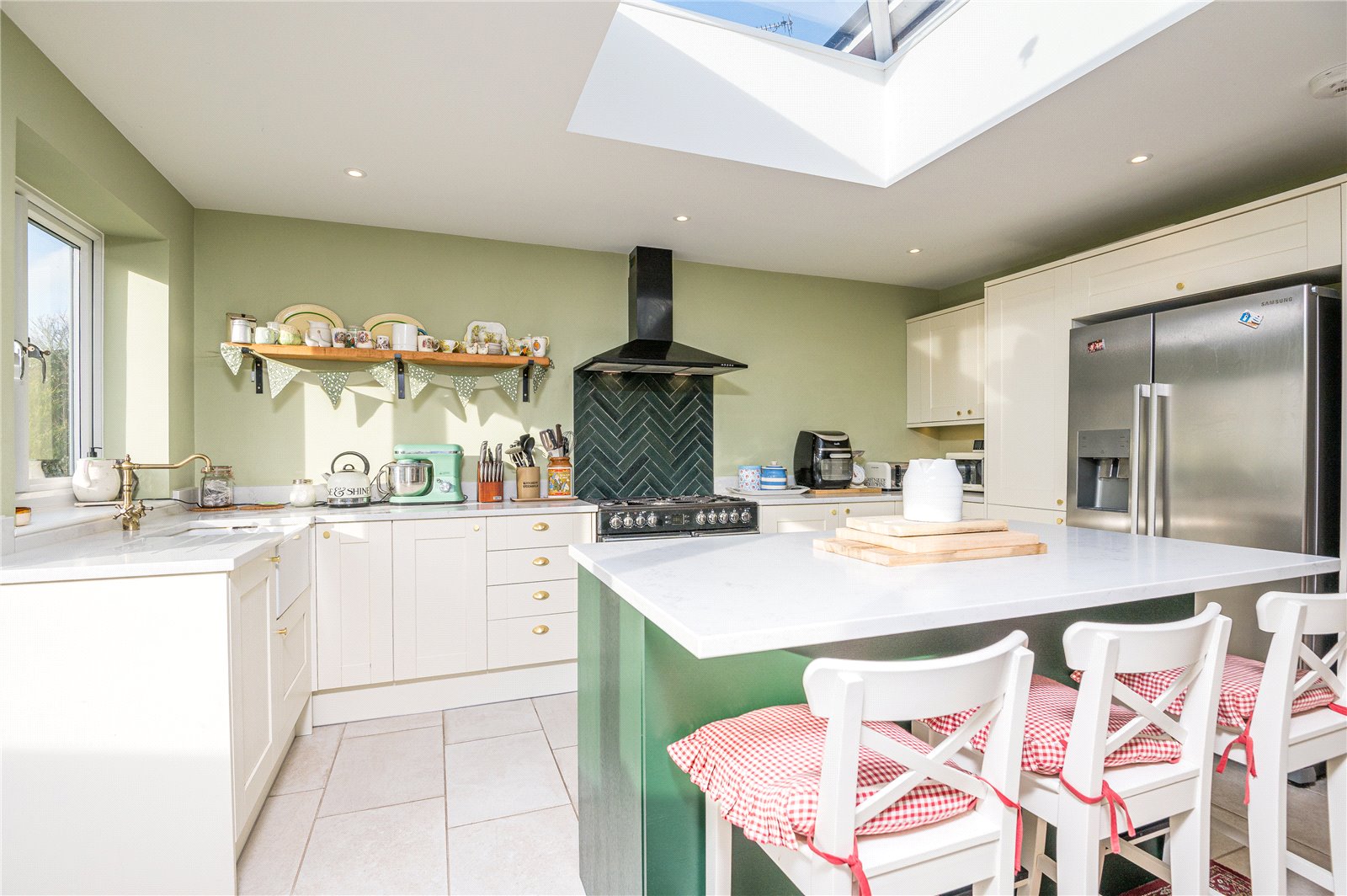 A professionally planned and fitted 'in-frame' Shaker style kitchen with brass fittings, centre Breakfast Island, spectacular lanterned skylight window and bespoke quartz surfaces with inset Butler style sink. The kitchen is fitted with a comprehensive range of base, full height and eye level cabinets with space and supply for range style cooker with herringbone tiled splashback and black, double width extractor canopy above. Space and supply for American style fridge/freezer and integrated dishwasher. Flagstone effect porcelain tiled floor. Three-panel powder coated aluminum bi-folding doors lead onto the rear sun terrace and double glazed window overlooking the landscaped rear garden.