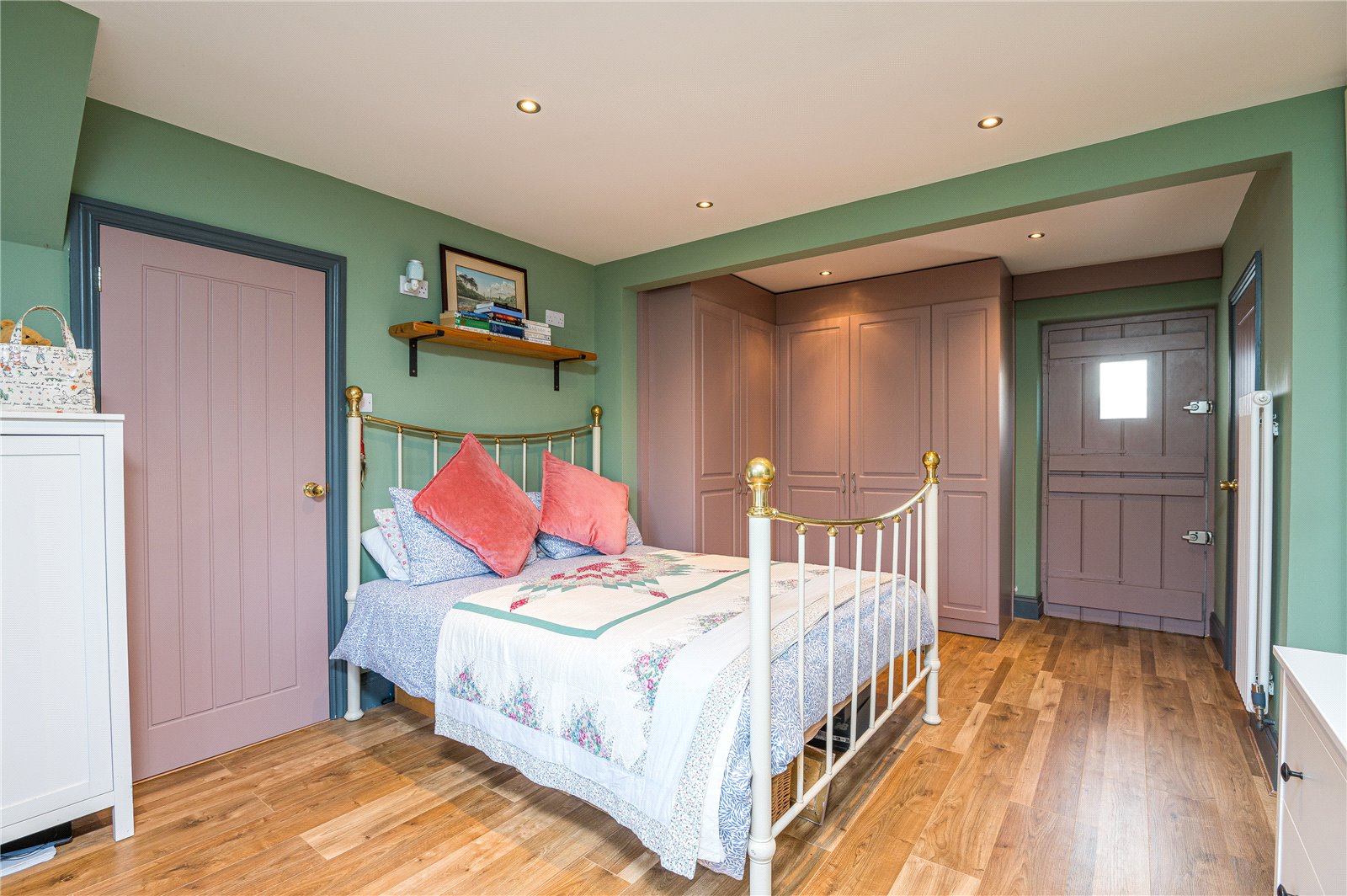 An impressive dual aspect room with stable door leading out to the landscaped rear garden and double glazed cottage style window to front. Access to boiler cupboard housing ‘Vallaint’ gas boiler and cloaks hanging space. Two old school style radiators. Oak effect flooring. Professionally fitted with a range of Shaker style furniture comprising of two double and one single wardrobe cupbaords with hanging and shelved storage space. High level skirting and smooth plastered ceiling with recessed LED led lighting.