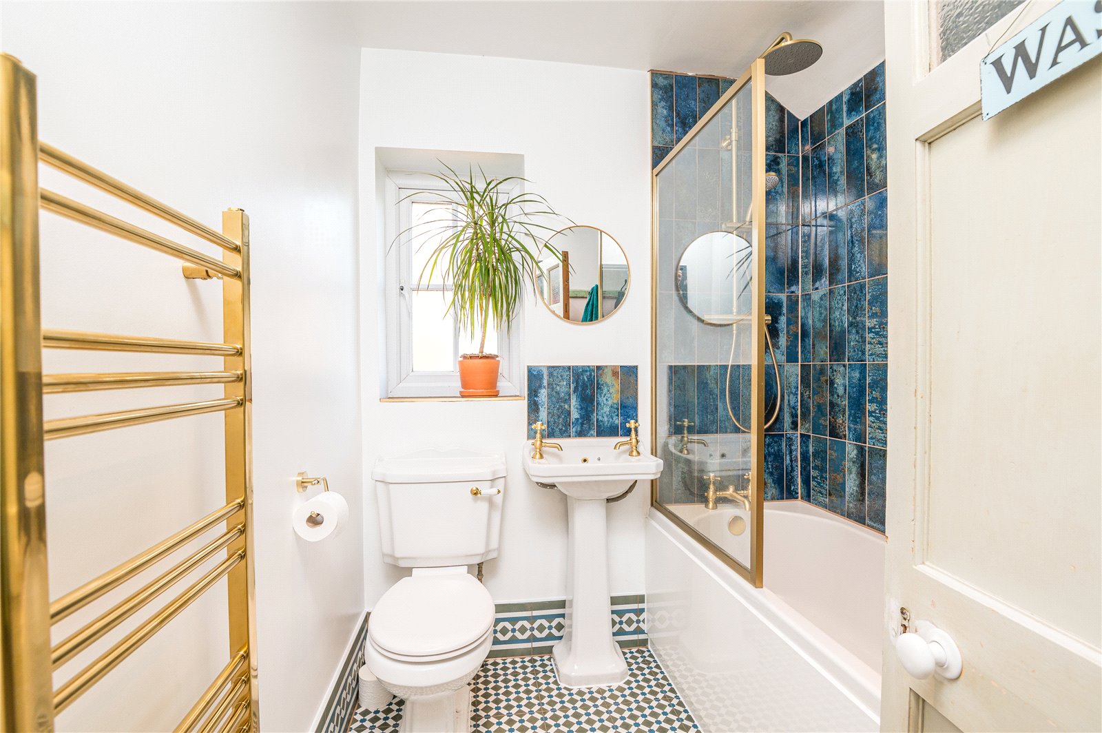 A beautifully appointed, re-modelled luxury bathroom with obscure double glazed window to side. Fitted with a three piece suite comprising of panel enclosed bath with Rainwater and hand-held shower fiitings in burnished brass, Regency style pedestal wash hand basin and matching close coupled WC. Victorian tiled floor with matching skirting. Contemporary brass effect heated towel rail. Full tiling to bath, shower and basin splashback in designer mettalic vertical tiles with matching sill. Smooth plastered, part vaulted ceiling with recessed spa style LED lighting.