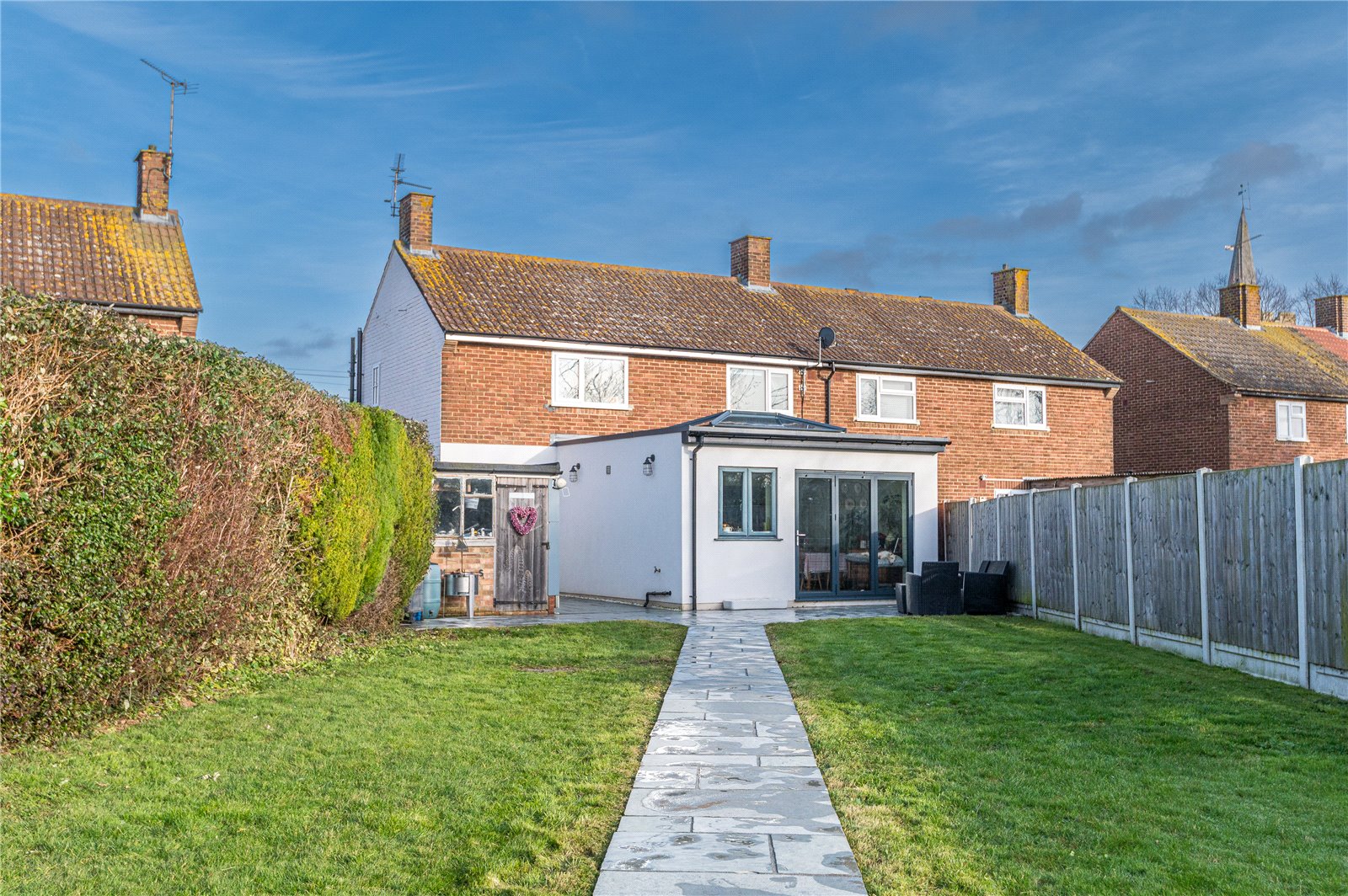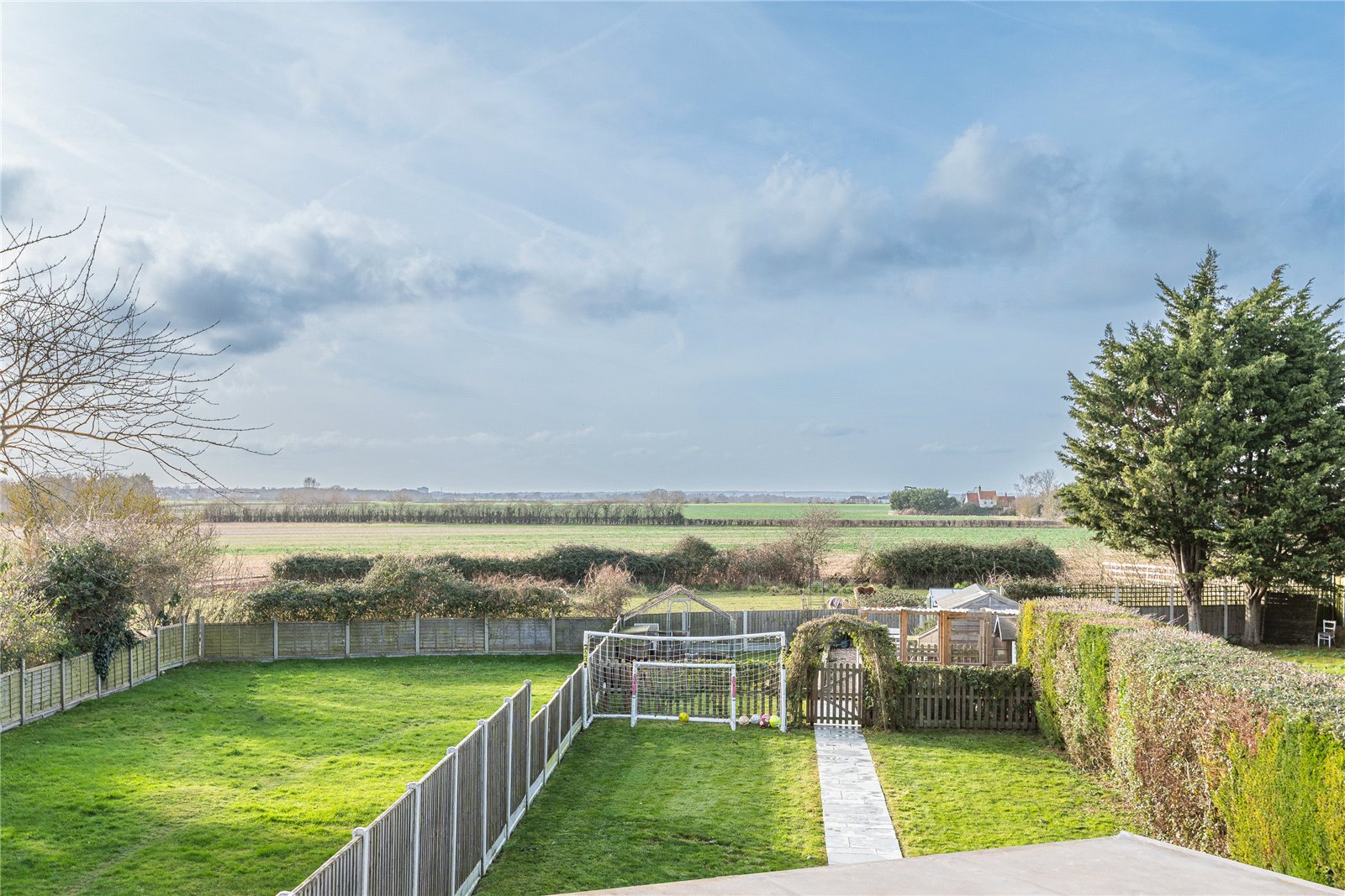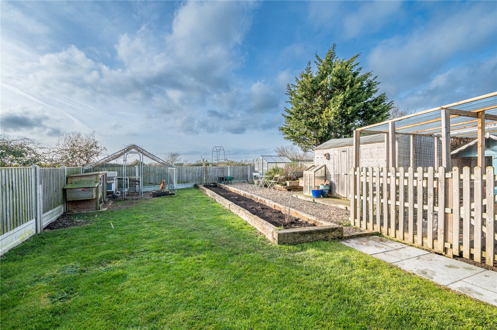 The beautifully landscaped, expansive rear garden has a due westerly aspect and commences from the kitchen/family room and master bedroom with a large rumbled sandstone terrace. A matching footpath leads through the main area of lawn where a gated picket fence leads into the cottage vegetable garden, chicken coop and greenhouse section with raised beds and hardstanding. Fencing to both side boundaries with low level fencing to the rear - taking full advantage of the westerly views (immediately) across a pony paddock and open farmland beyond. Secure timber gated side access to the front garden/driveway.