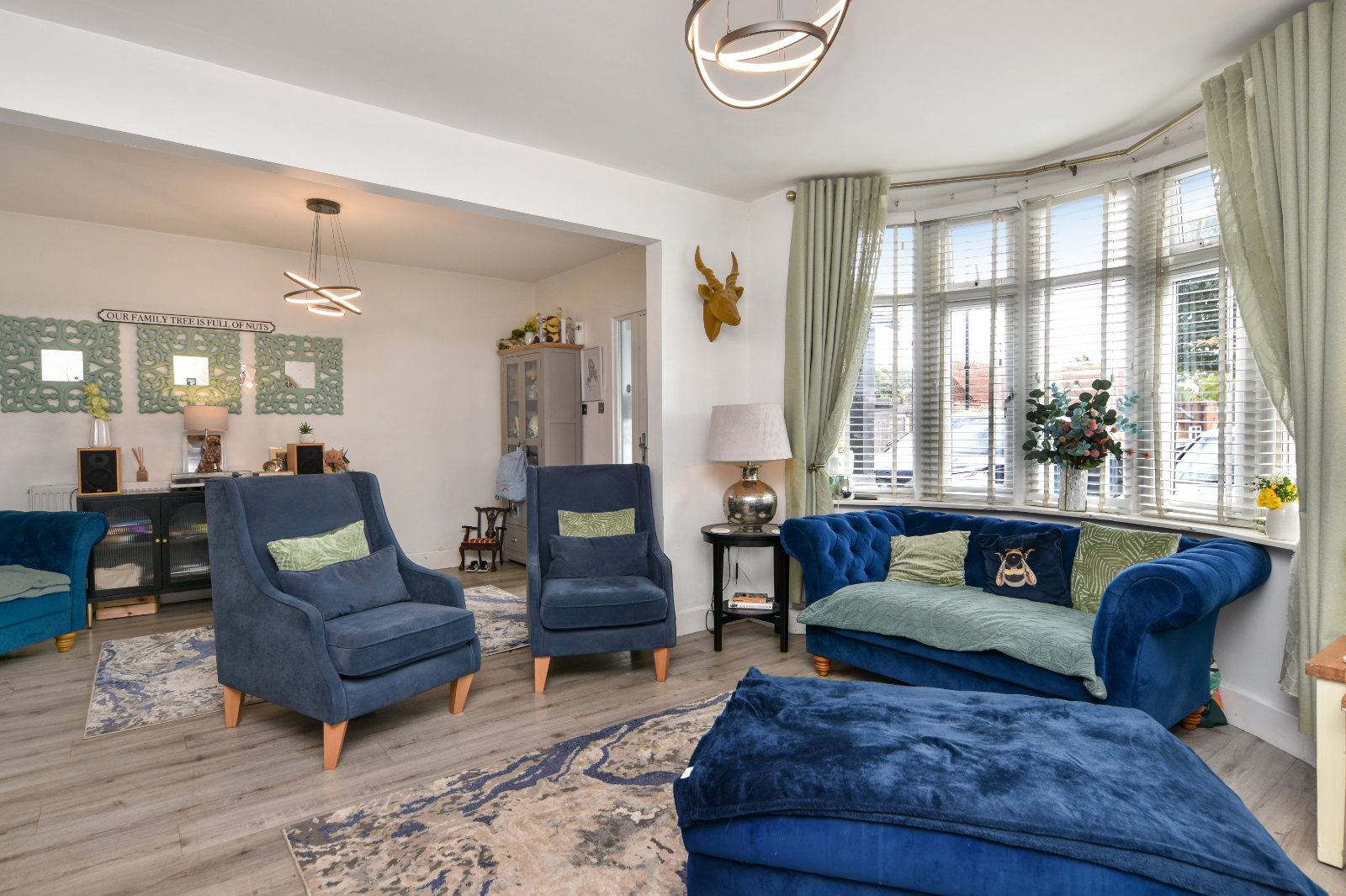 Feature uPVC double glazed bay window to the front aspect with further uPVC double glazed window adjacent. This is a period-style cast iron fireplace with ornate floral tiled inserts to either side, providing a striking decorative finish. It incorporates a wood-burning stove set within the grate, offering both character and practicality. The surround is finished with a traditional mantelpiece, enhancing the focal point of the room. Wood effect laminate wood effect flooring. Pair of oak-style doors open to the inner hallway, allowing a seamless flow between living areas. Radiators. Smooth plastered ceiling inset with central ceiling rose.