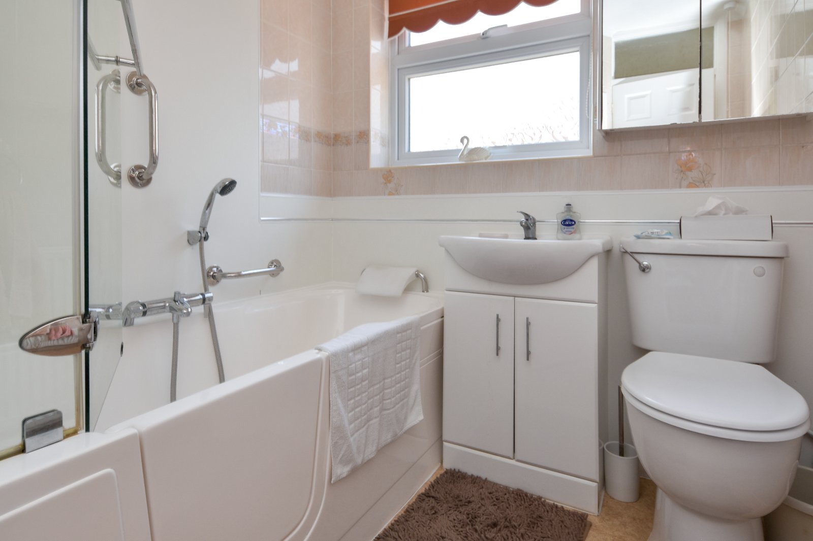 Obscure uPVC double glazed window to side aspect. The Bathroom is fitted with a three piece suite comprises vanity wash hand basin with mixer tap over and storage cupboards under, low level flush wc and 'disability' accessed panelled bath with mixer taps and handheld shower attachment, with further integrated shower and fitted shower screen. Radiator. Partly tiled walls. Door to built airing cupboard inset with radiator and linen shelving. Smooth plastered ceiling.