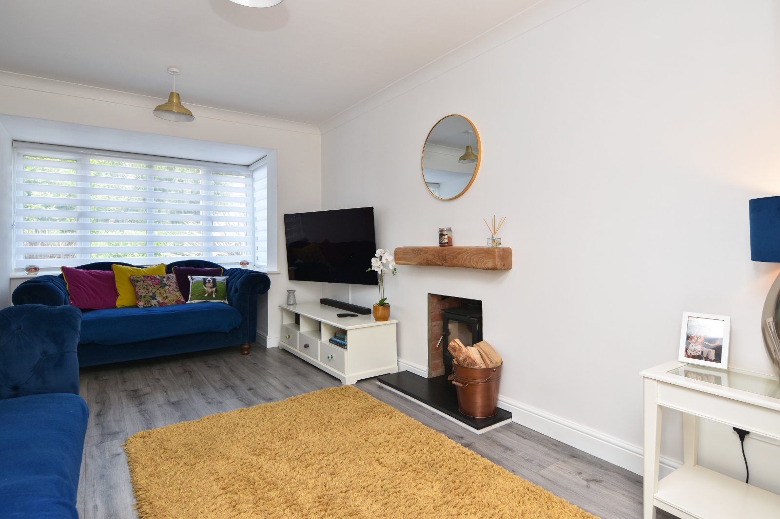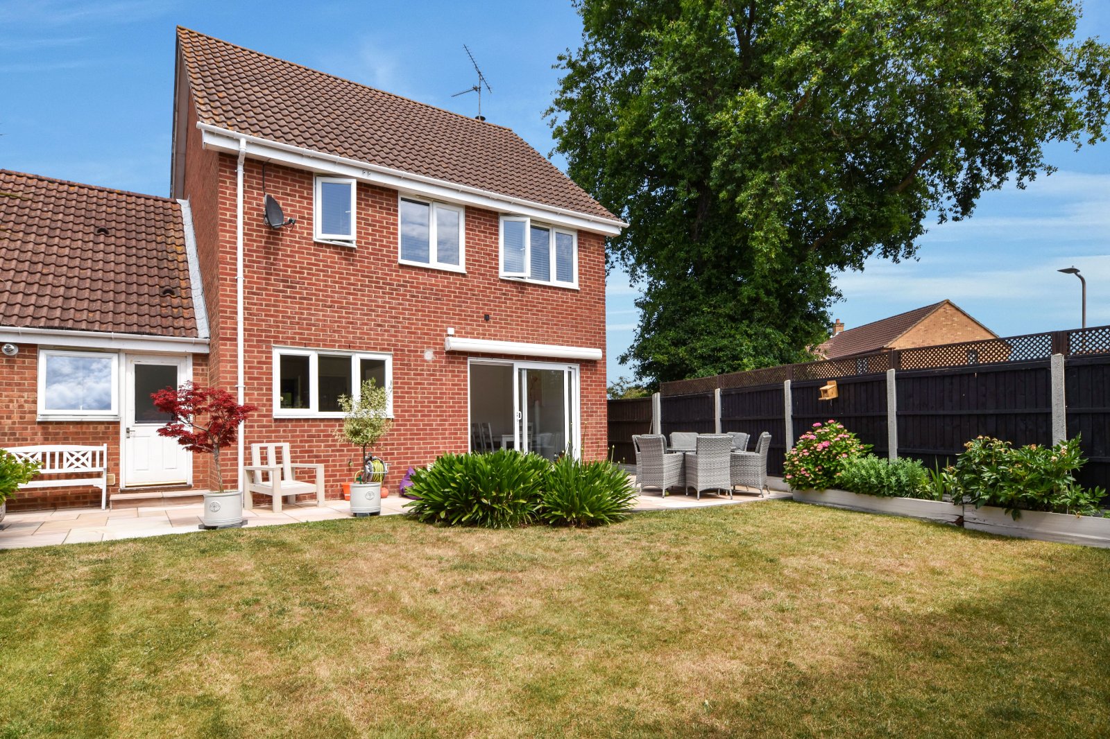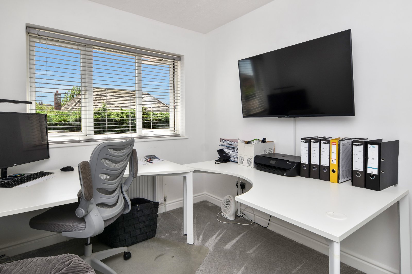 The home is set within a pretty cul-de-sac from Churchfields, and offers a stylish, low-maintenance frontage, featuring a smart block-paved driveway providing off-road parking. Neat decorative stone chippings and well-kept border planting enhance the kerb appeal. Direct access to Garage via electric roller garage door. A side access gate leads conveniently to the rear garden.