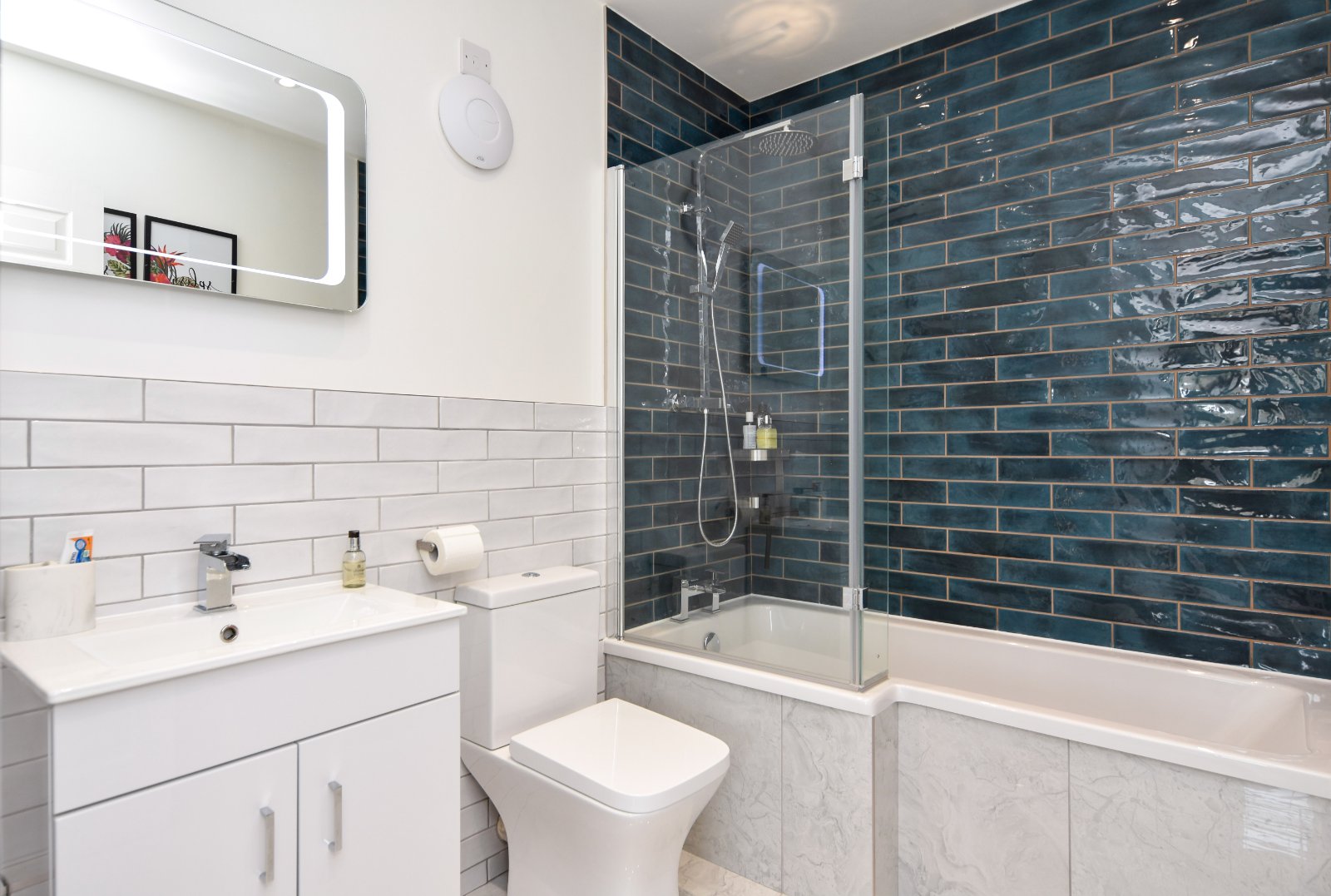 This beautifully updated bathroom features a tile-enclosed bath with a sleek glass shower screen, mixer tap, handheld shower, and a luxurious drencher-style rainfall shower head above. The striking gloss ‘metro’ tiling creates a bold feature wall, while the contrasting white brick-style tiles add brightness and balance.