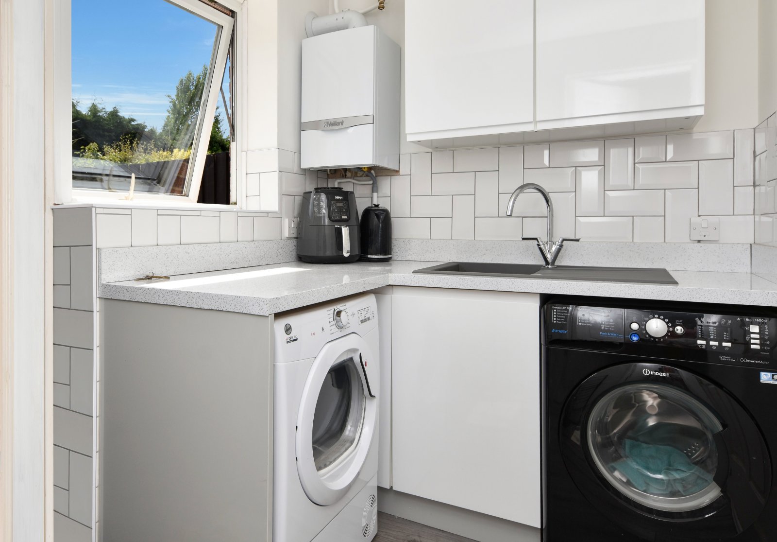 Part glazed panelled door provides access to rear Garden. uPVC double glazed window to rear. The Utility is fitted with eye and base level units with 'sparkle fleck' worktops inset with single drainer sink unit with mixer tap over. Partly tiled walls. Under counter recess and plumbing for washing machine and tumble dryer. Wall mounted 'Valiant' boiler. Courtesy door provides access to Garage. Radiator. Wood effect flooring. Ceiling mounted extractor fan. Smooth plastered ceiling.