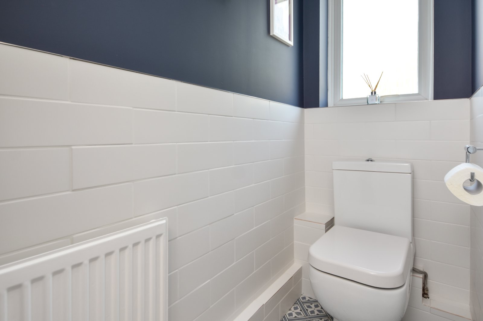 Obscure uPVC double glazed window to front aspect. The modern two piece suite comprises low level dual flush wc and pedestal wash hand basin with mixer tap over. Tiling to dado height. Attractive tiled flooring. Radiator. Smooth plastered ceiling.