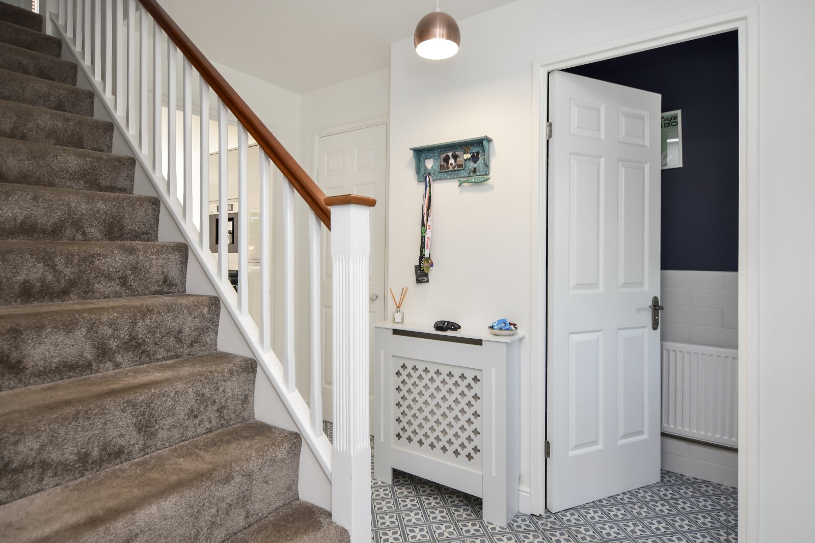 Stairs rising to first floor accommodation with spindle balustrade. Attractive tiled flooring. Radiator inset to decorative cabinet. Panelled door to recessed Cloaks/Storage cupboard with hanging space and shelving. Access to Kitchen and Living Room. Smooth plastered ceiling. Panelled door to;