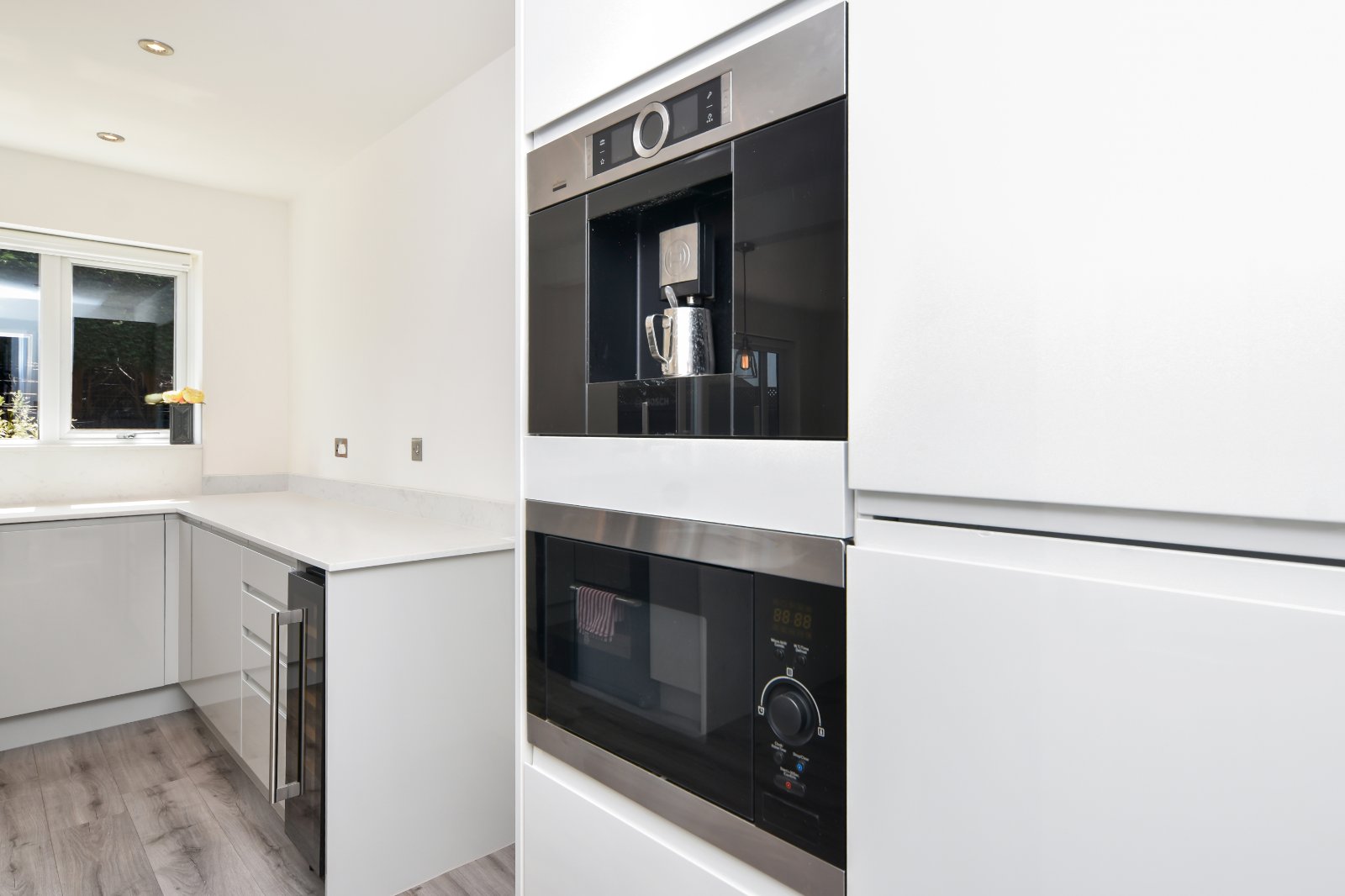 The Kitchen is fitted with a range of sleek high-gloss cabinetry with a host of integrated appliances, including an upright fridge/freezer, microwave, and , 'Beko' dishwasher. Impressive eye-level ‘Bosch’ 'Smart Home Connect' Coffee machine – enjoy barista-style coffee at the touch of a button, via app or voice control!!!. A striking ‘marble-wrapped’ return provides additional worktop space and houses an impressive range-style oven with a five-ring gas burner, enhanced by a trio of stylish pendant lights overhead. The marble worktop continues to a one and a quarter sink unit with grooved drainer and mixer tap over. Panelled door to large under stair storage cupboard. Attractive wood effect flooring. Two radiators. Smooth plastered ceiling inset with recessed lighting. Further panelled door to;