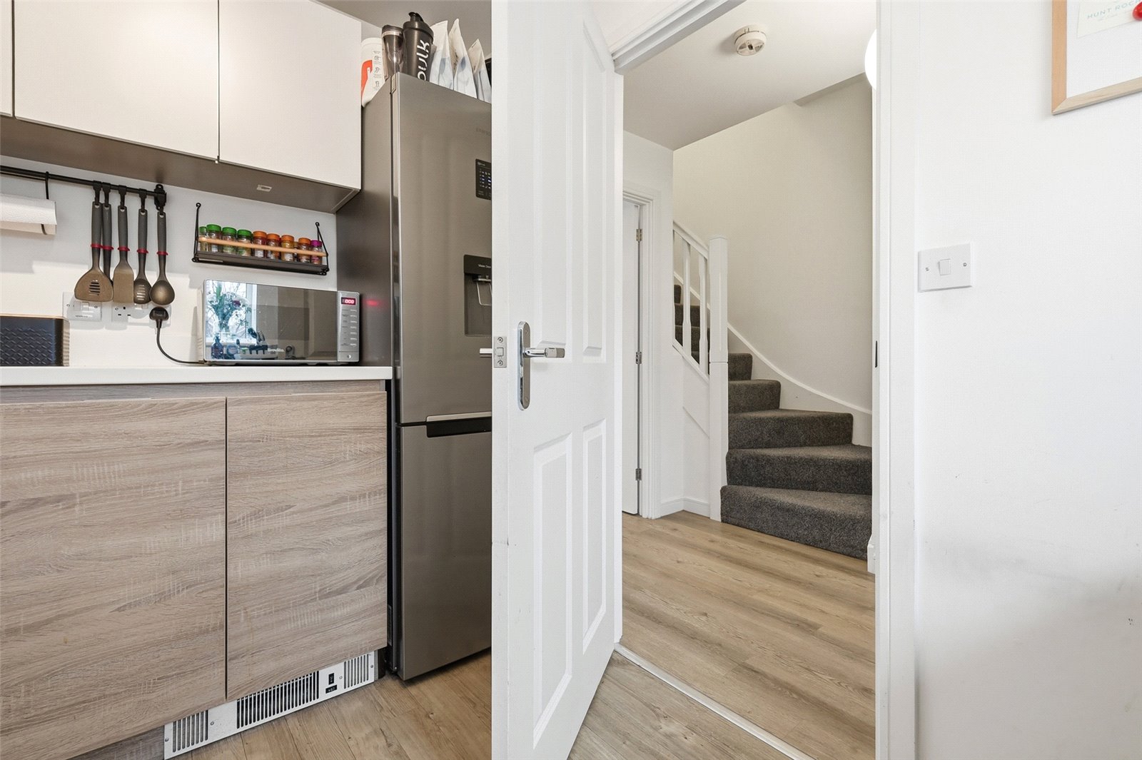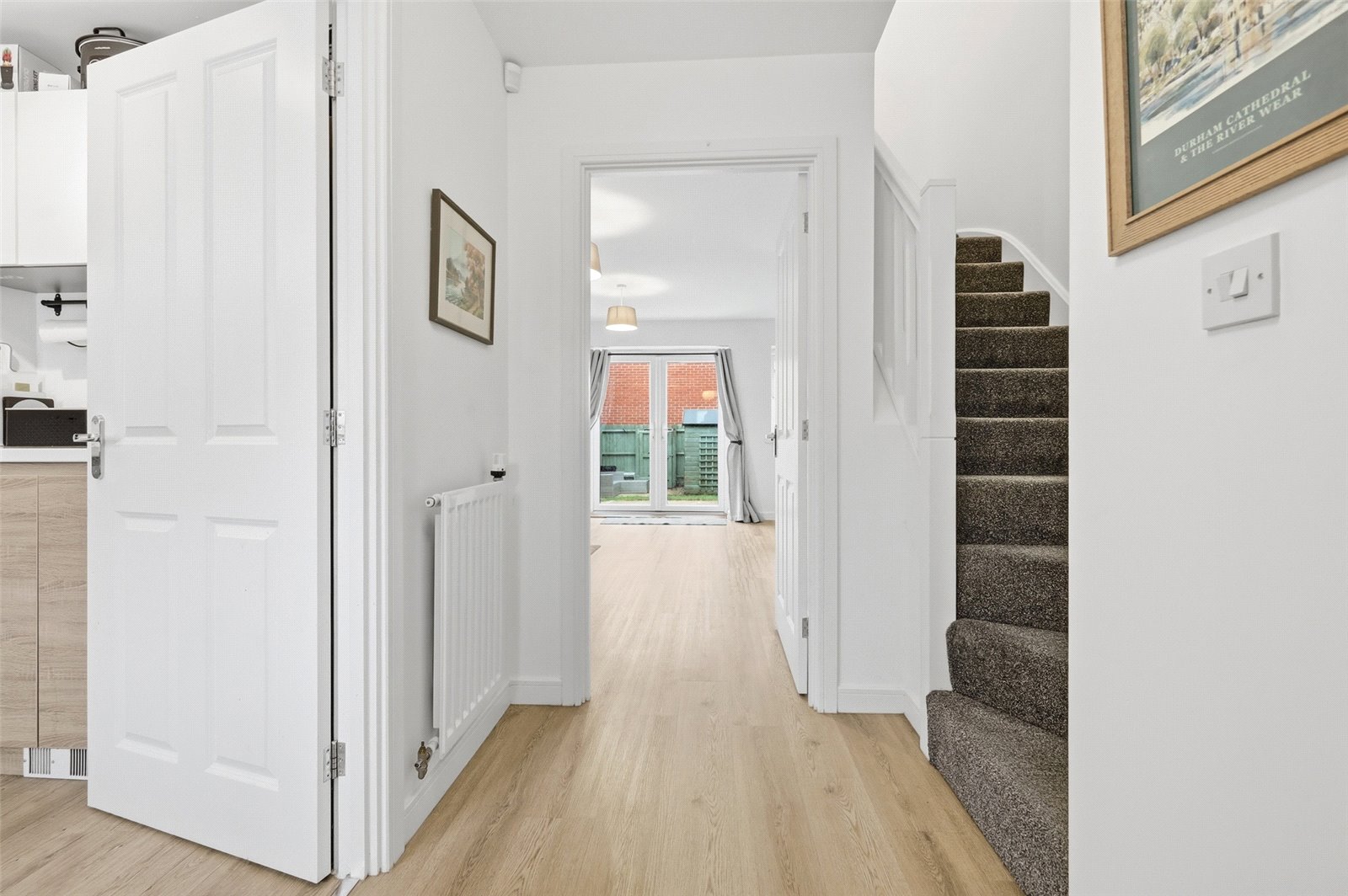 Approached via composite front door with inset obscured glazed panel. Doors lead off to ground floor rooms. Stairs rising to first floor accommodation. Wall mounted radiator. LVT flooring. High level skirting. Smooth plastered ceiling.