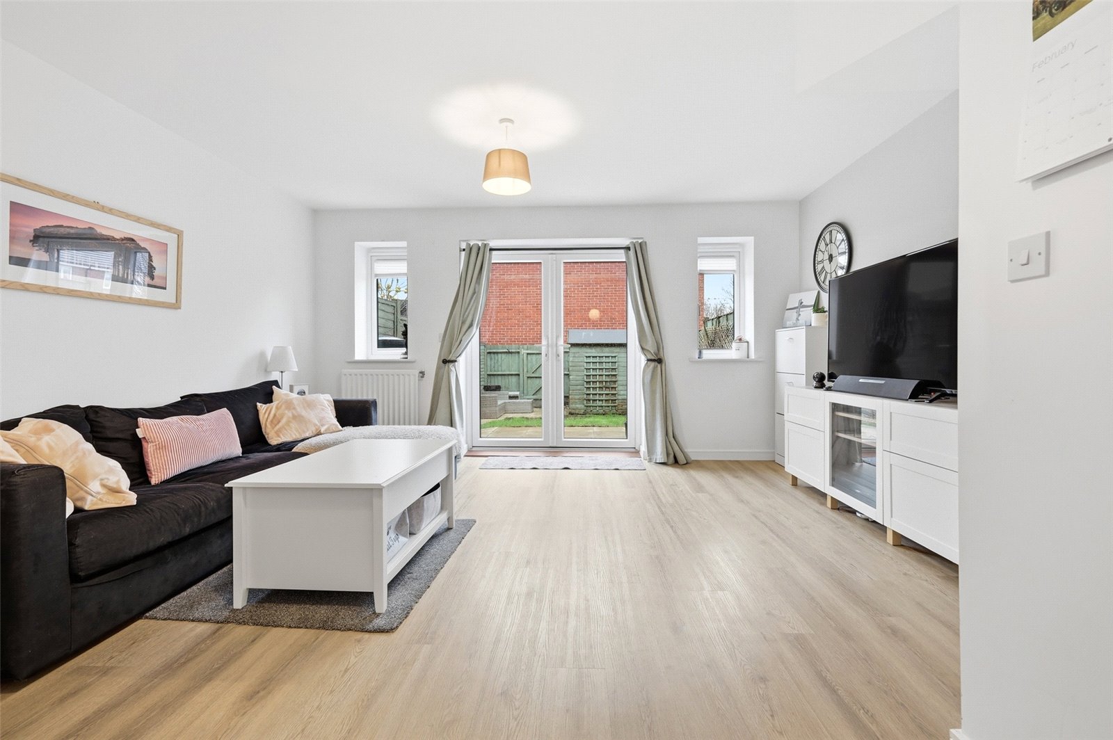 UPVC double glazed French doors to rear leading to rear garden with two double glazed windows adjacent. Two wall mounted radiators. Understairs storage cupboard. LVT wood effect flooring. High level skirting. Smooth plastered ceiling.