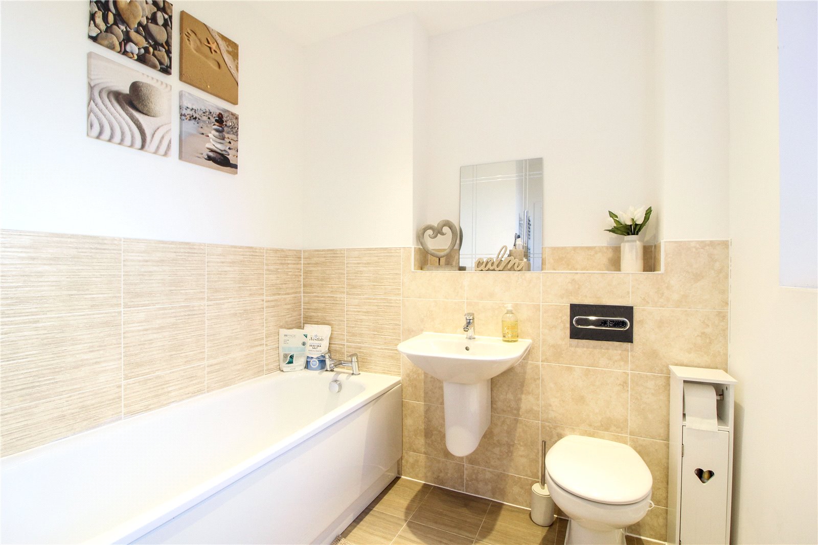 Lino to floor, smooth ceiling, spotlights to ceiling, part tiled walls, bath, sink, WC and towel rail, double glazed, obscure window to side aspect