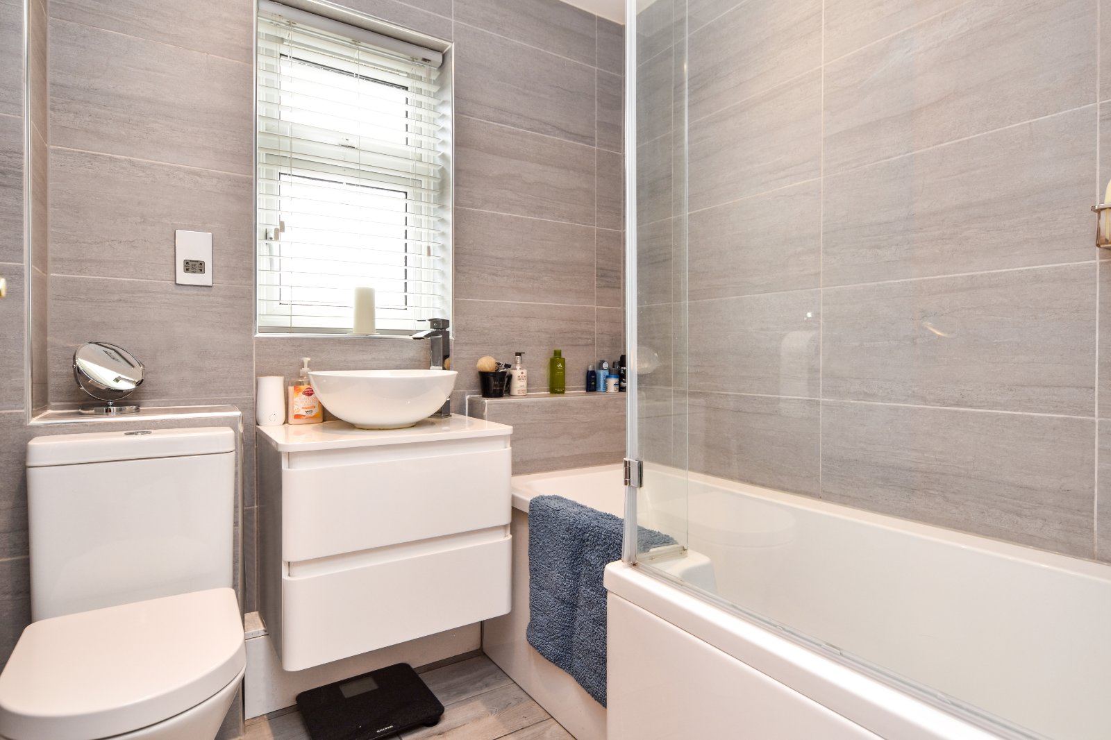 Obscure uPVC double glazed window to side aspect. The fully tiled bathroom comprises a panelled enclosed 'shower bath' with fitted shower screen, mixer taps and integrated shower unit with overhead drencher style and hand-held attachment. Attractive circular countertop ceramic vanity wash hand basin with mixer tap with drawers under and dual flush WC. Shaver point. Ladder style heated towel rail. Tiled flooring. Textured ceiling.