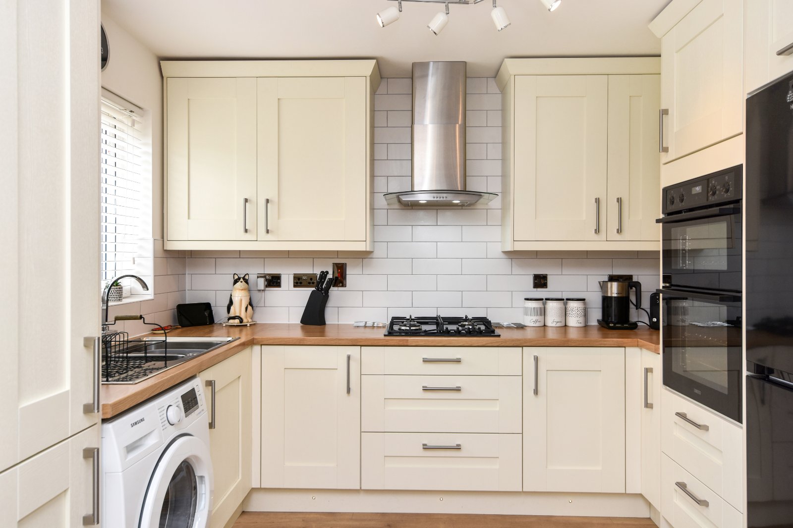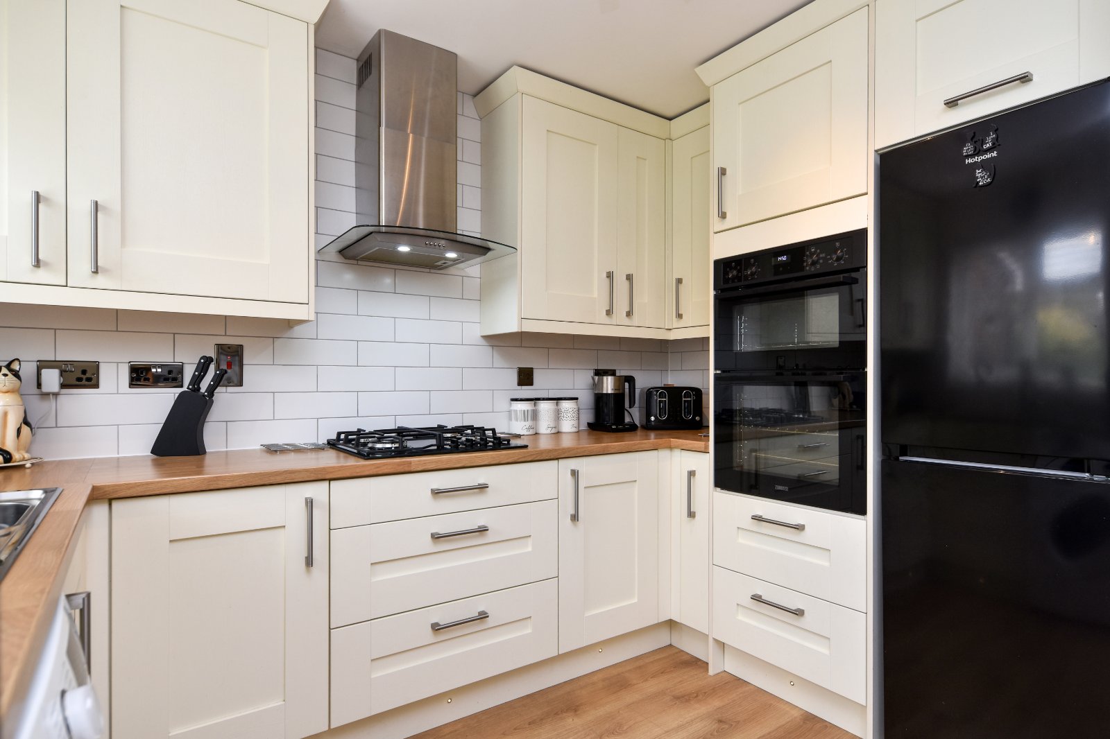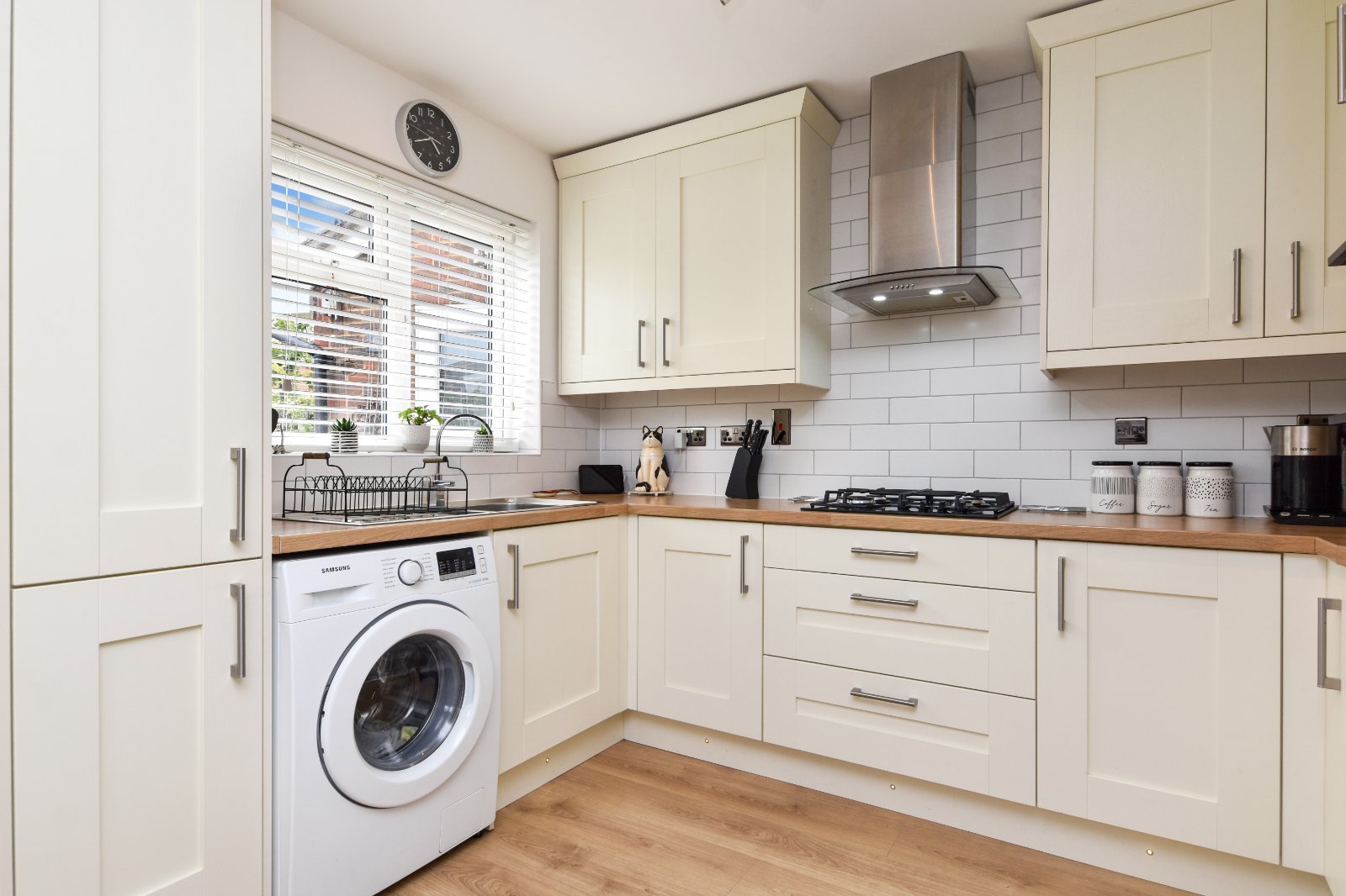 uPVC double glazed window to rear aspect overlooking the rear Garden. The beautiful kitchen is fitted with a range of eye and base level cabinetry to three aspects with wood effect square edge working surfaces over inset with single drainer stainless steel one-and-a-quarter bowl unit with mixer tap over. Built in eye level pair of 'Zanussi' ovens with split level four ring 'Zanussi' gas hob with wall mounted stainless steel extractor canopy over. Attractive splashback tiling. Feature 'kickplate' LED 'pin-hole' lighting. Freestanding 'Hotpoint' upright fridge/freezer (to remain). Undercounter 'Samsung' washing machine (to remain). Laminate wood effect flooring. Textured ceiling.