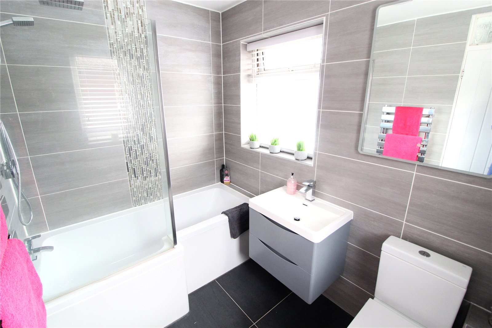 Fitted with a three piece contemporary white suite comprising panelled bath with mixer tap, twin head shower and screen. Wash hand basin set within vanity unit and low flush w.c., Ceramic tiled floor. Fully tiled walls. Heated towel rail. Double glazed obscure windows to side and rear.
