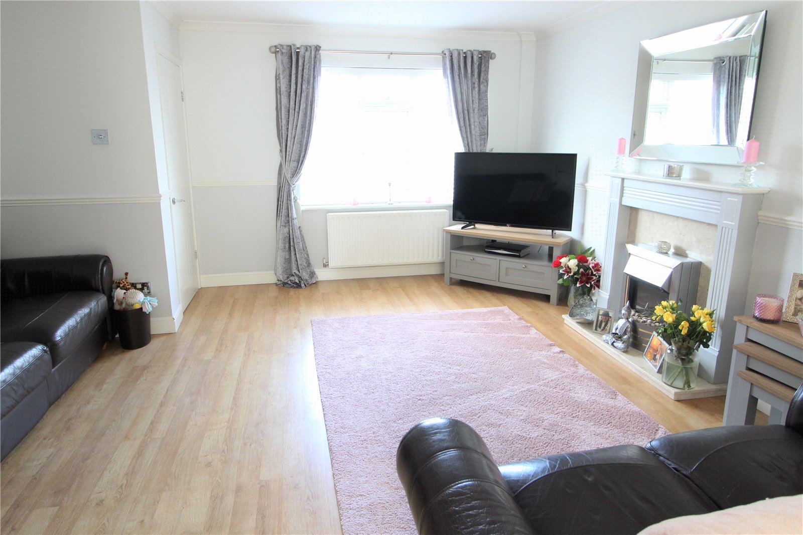 Wood effect laminate flooring. Radiator. Staircase to first floor and landing. Dado rail. Panelled door to