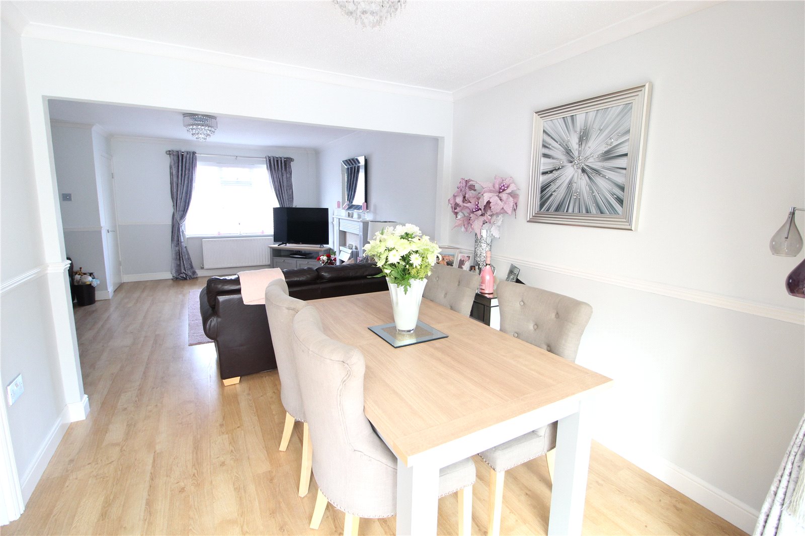 Lounge Area has double glazed leaded light window to front. Double radiator. Understairs storage cupboard. Wood effect laminate flooring. Feature wooden fireplace with electric fire and marble effect hearth. Coving. Dado rail. Dining Area has double glazed sliding patio doors giving access to conservatory. Wood effect laminate flooring. Double radiator. Access to kitchen.