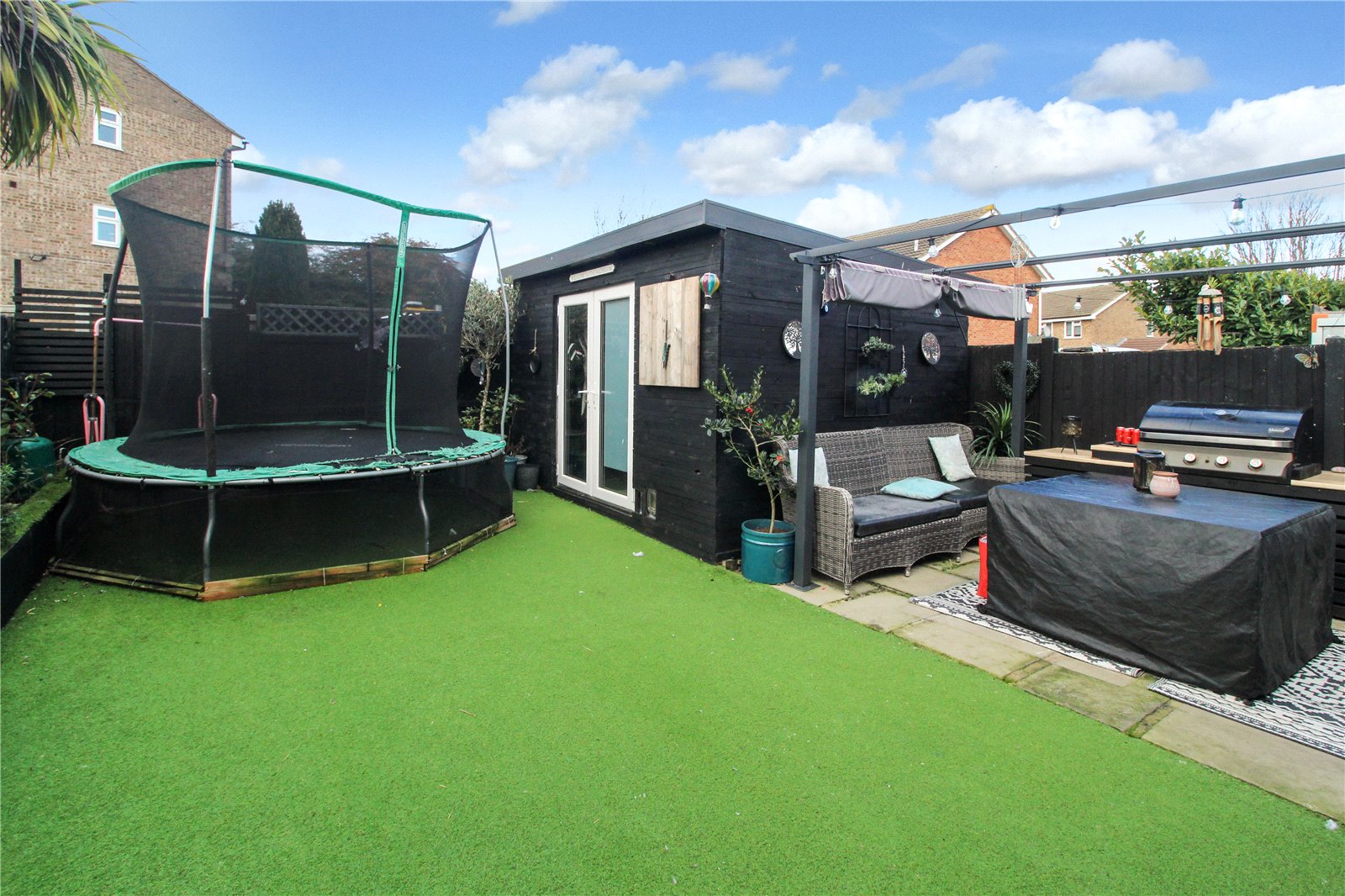 Generous sized rear garden with outbuilding. Mostly artificial grass with raised flower beds to boarder allowing for planting. Paved area used for entertaining.