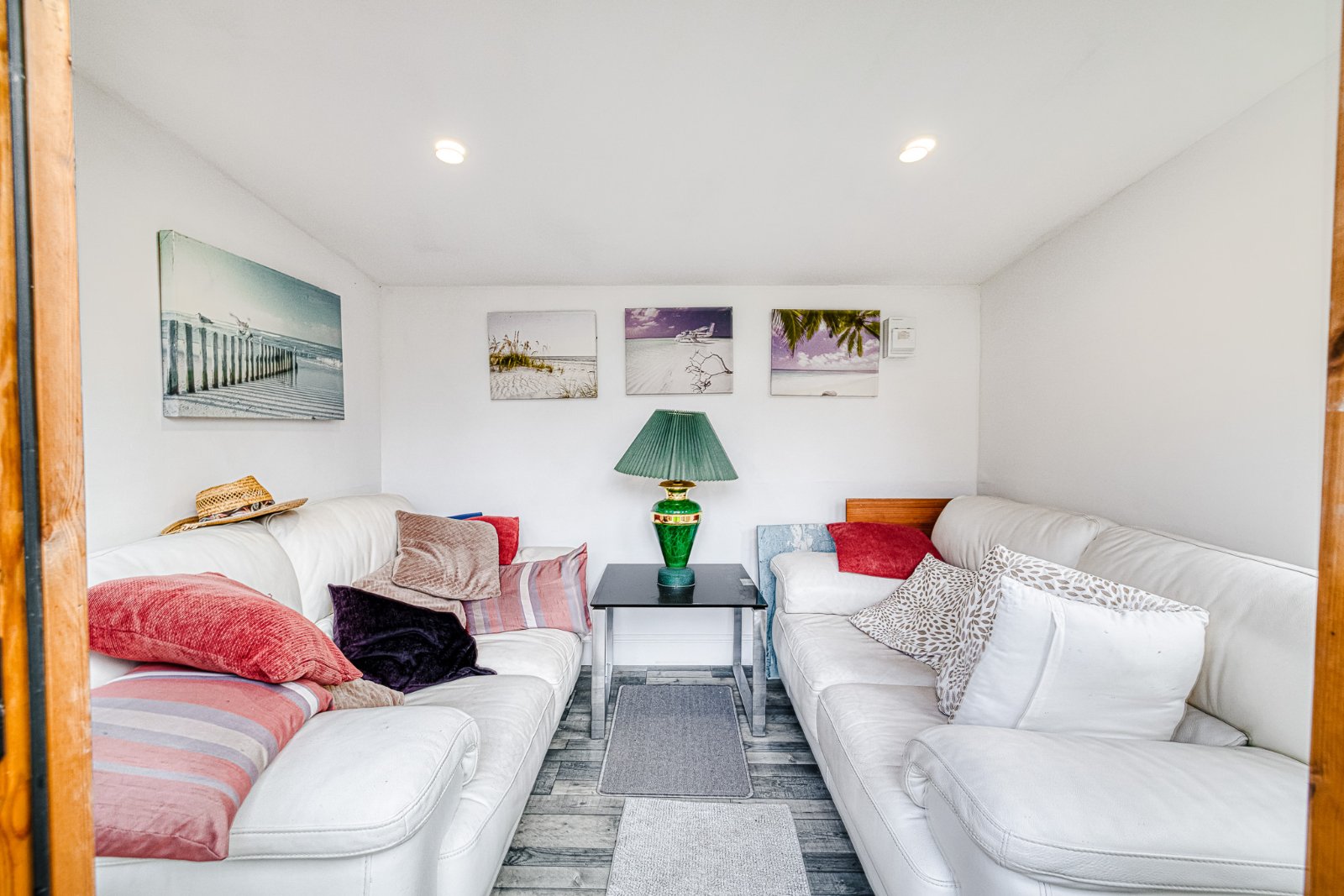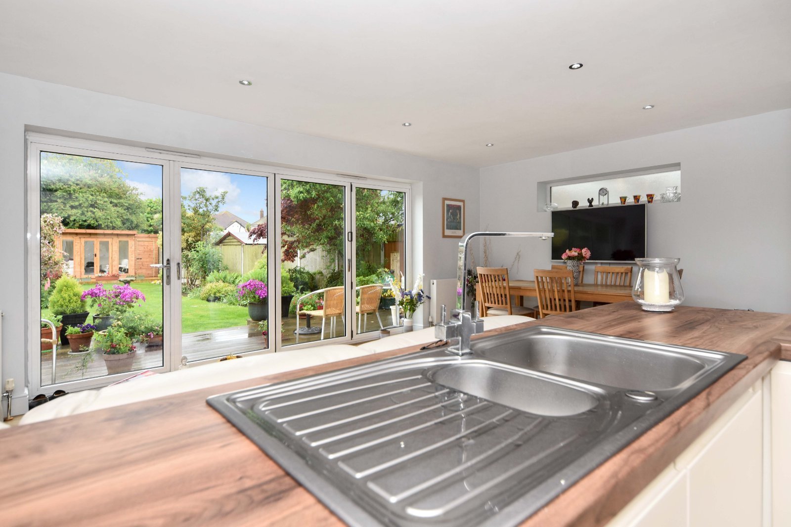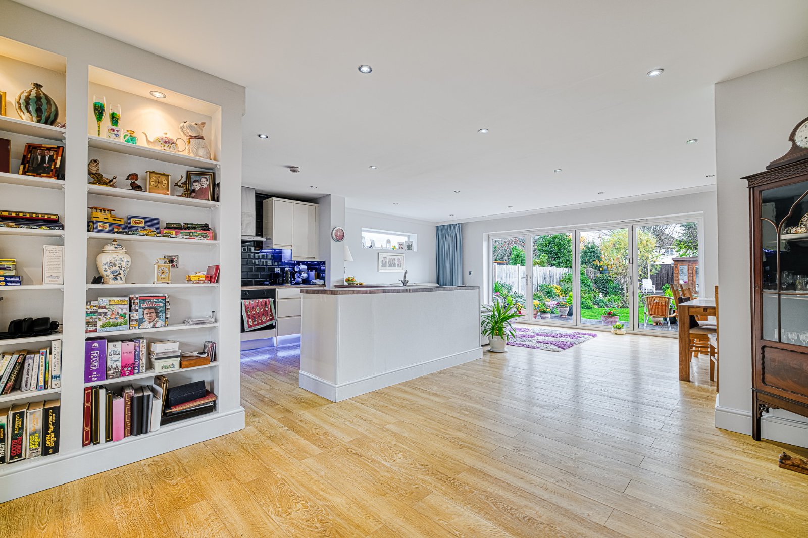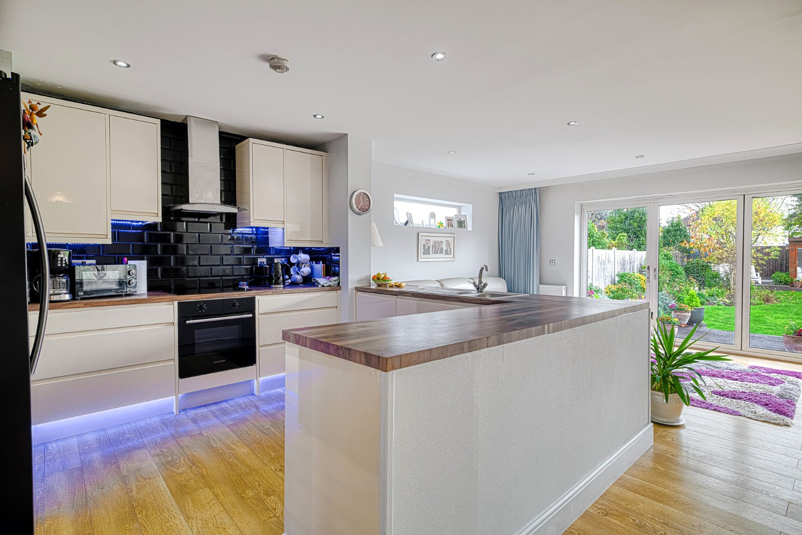 Pair of high level obscure uPVC double glazed windows to either side. Bank of uPVC double glazed bi-fold doors opening onto the decked seating area of the rear Garden with pelmet inset with colour changing LEDs. Two radiators.