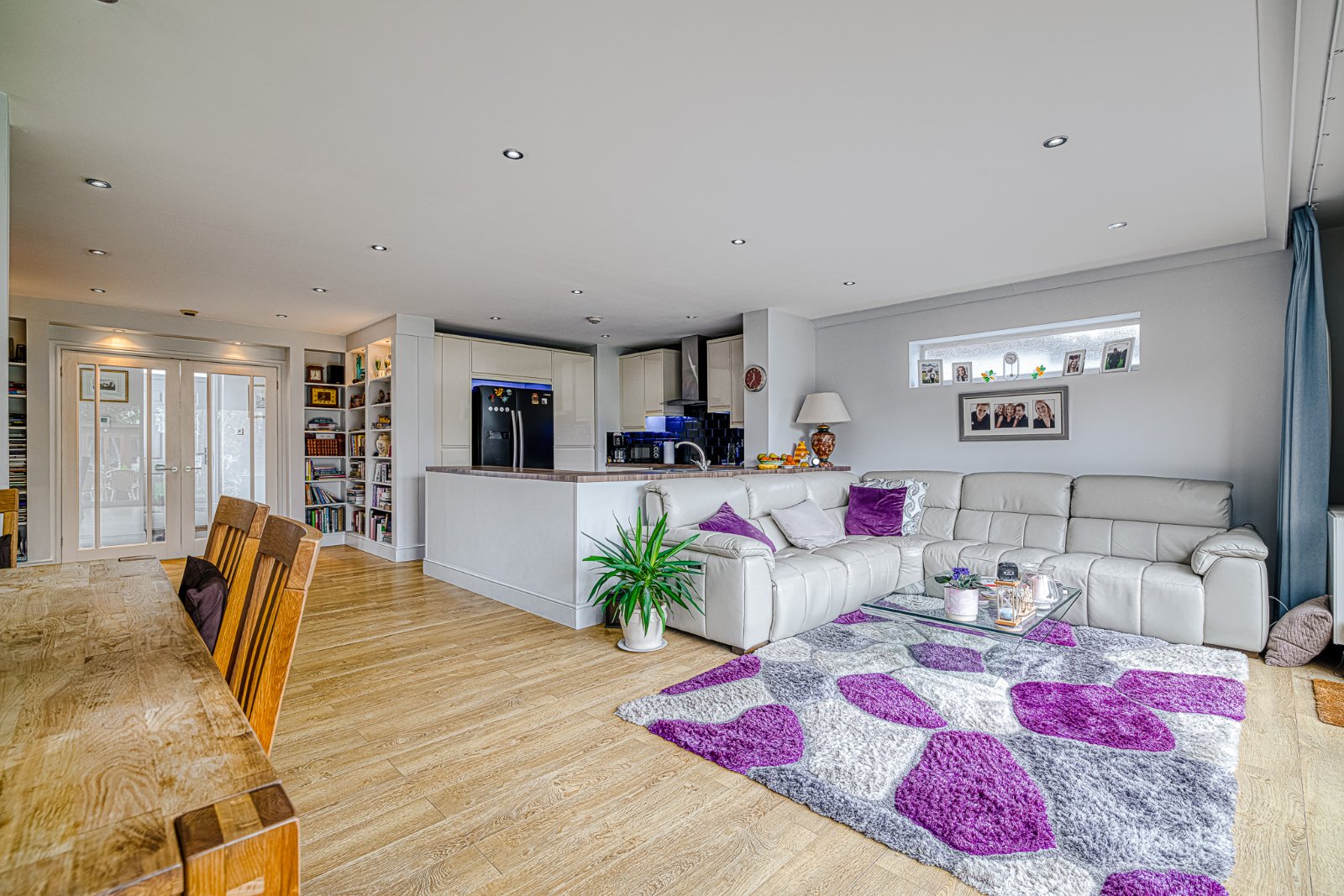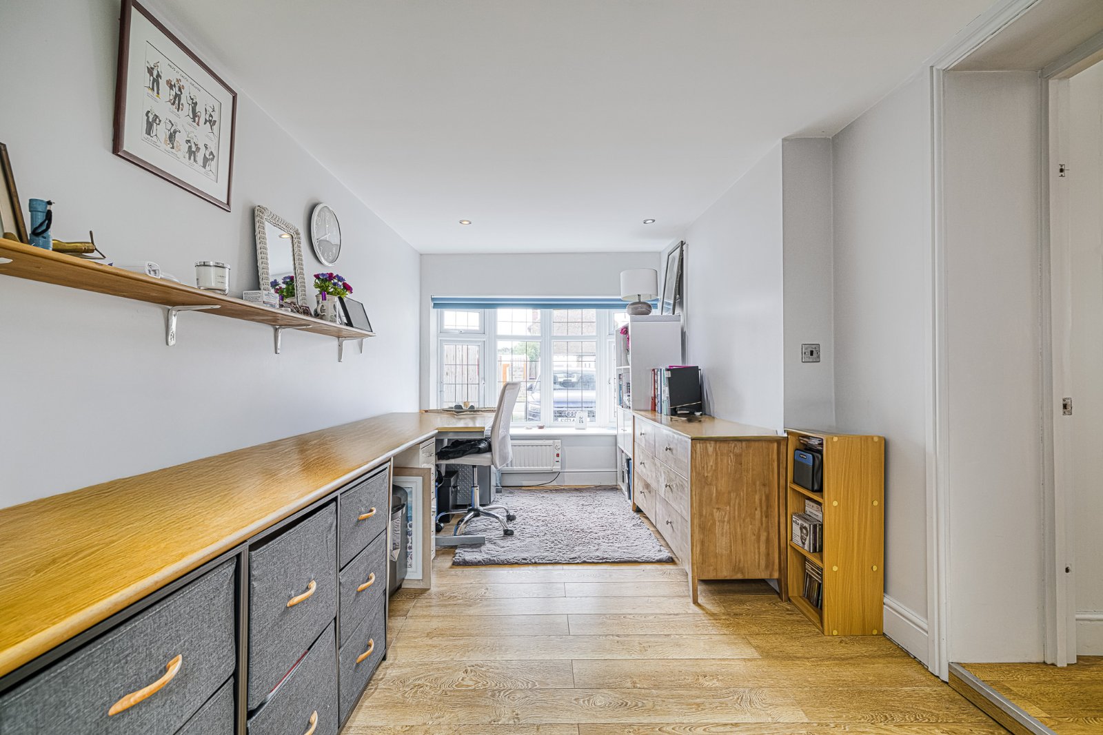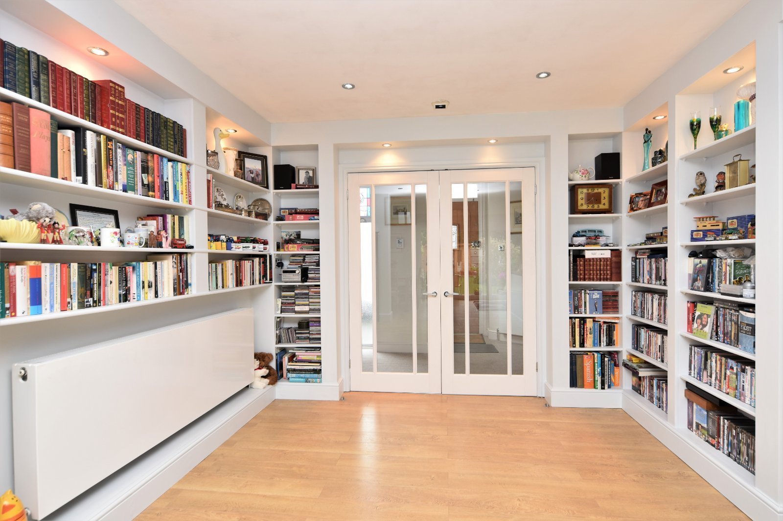 The room is approached a pair of part glazed doors from the Hallway and commences with a bank of fitted book shelves to either side inset with lighting. Radiator. High quality laminate wood effect flooring throughout. Radiator. Door providing access to 'Home Office & Utility Room'. Coving to smooth plastered ceiling inset with recessed lighting.