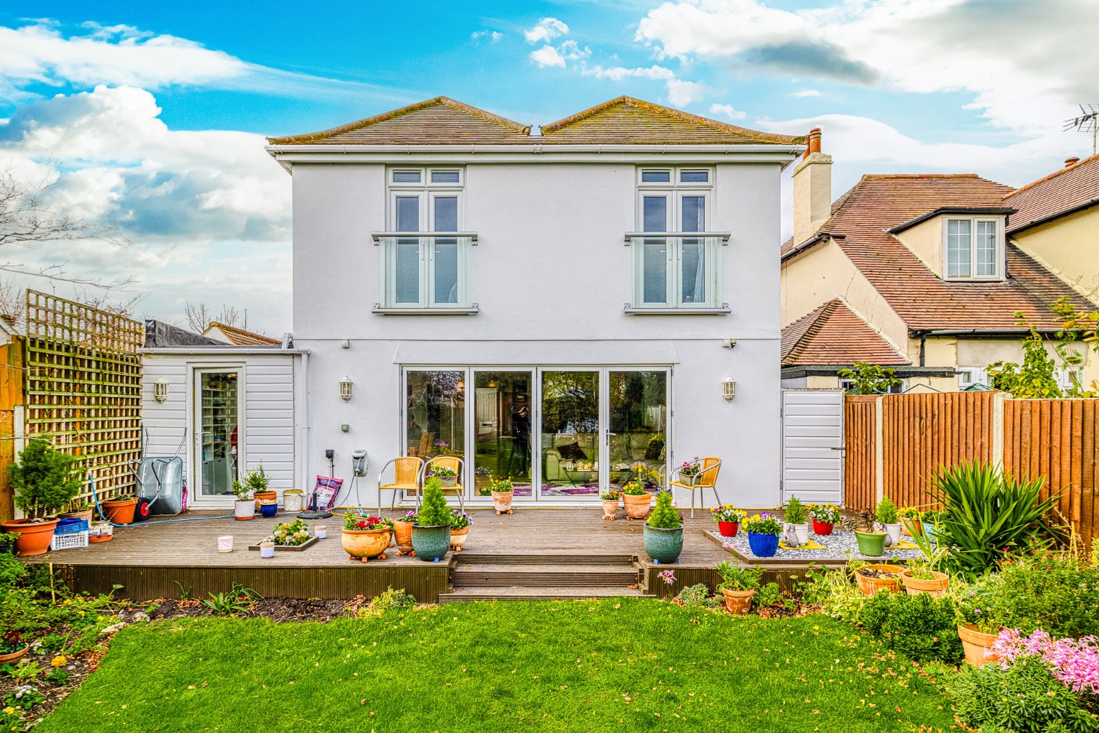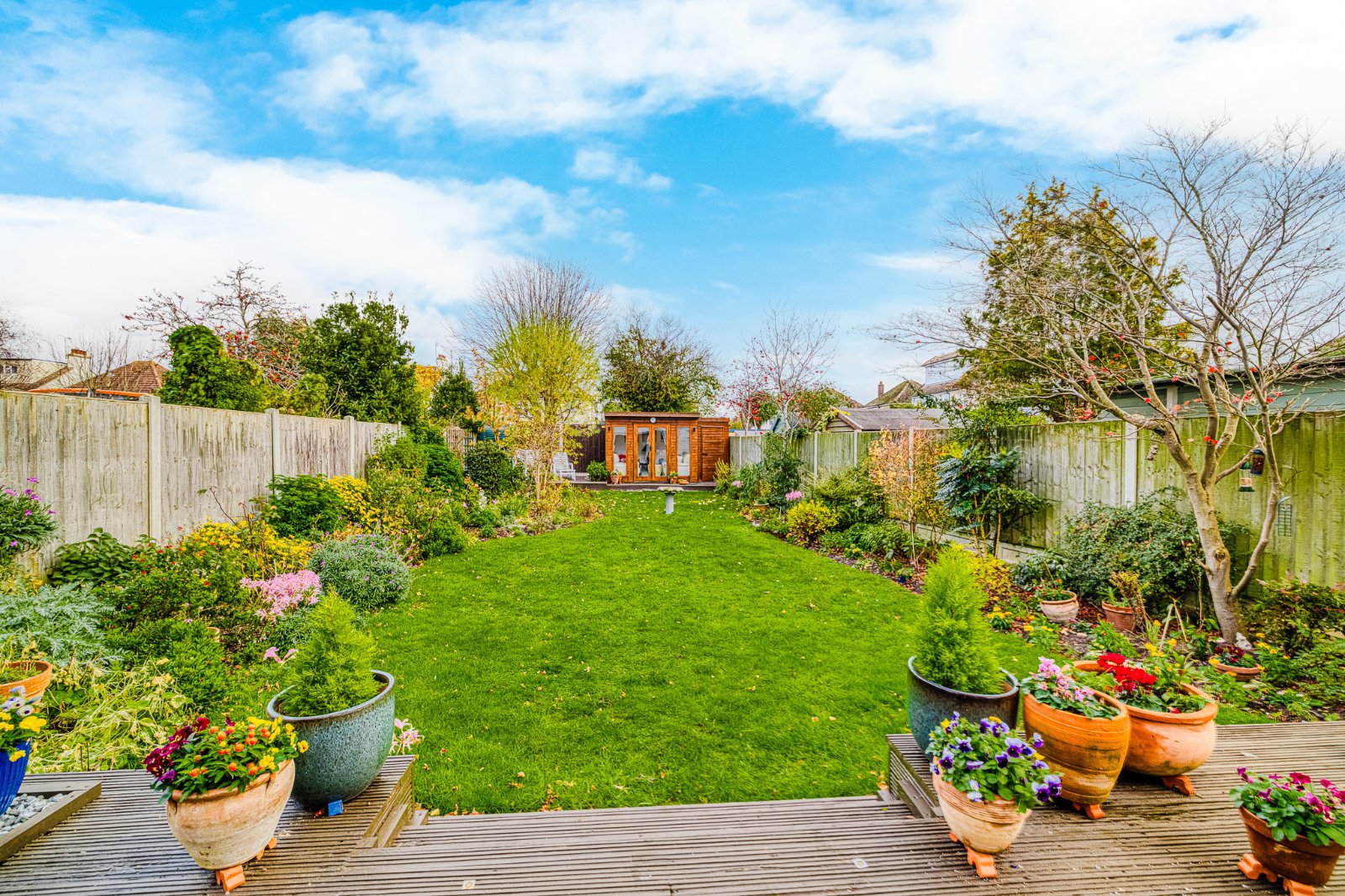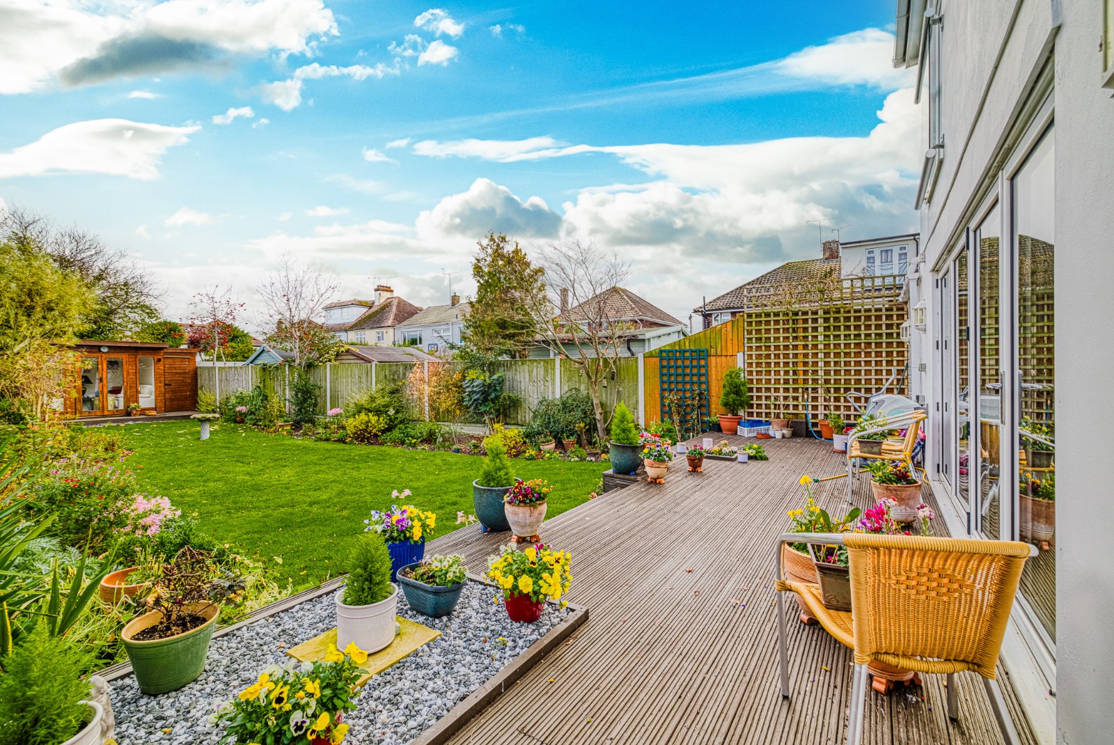 A decked patio seating area sits to the side, offering an attractive spot to enjoy the surrounding garden.