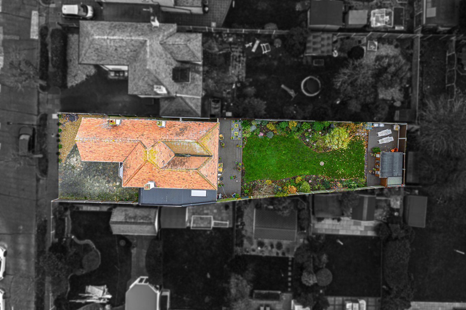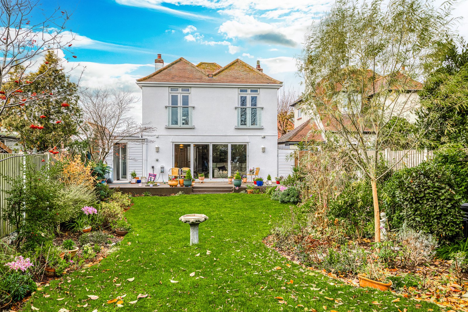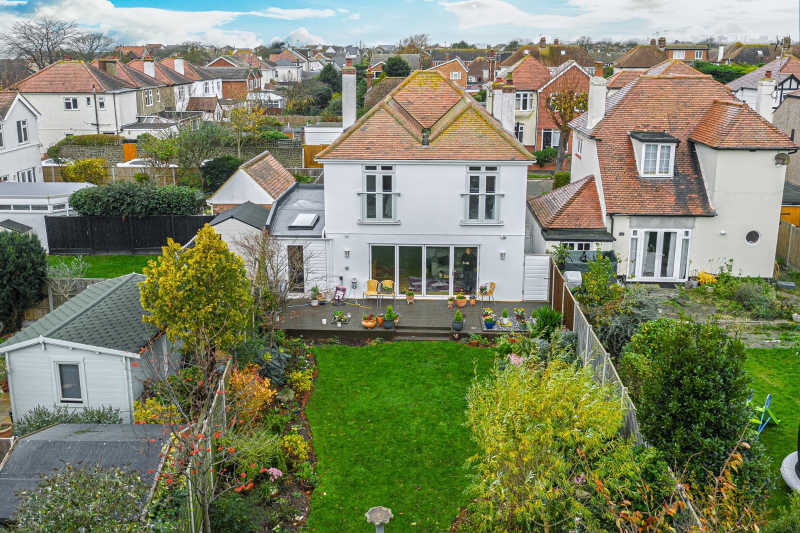 A decked patio seating area sits to the side, offering an attractive spot to enjoy the surrounding garden.