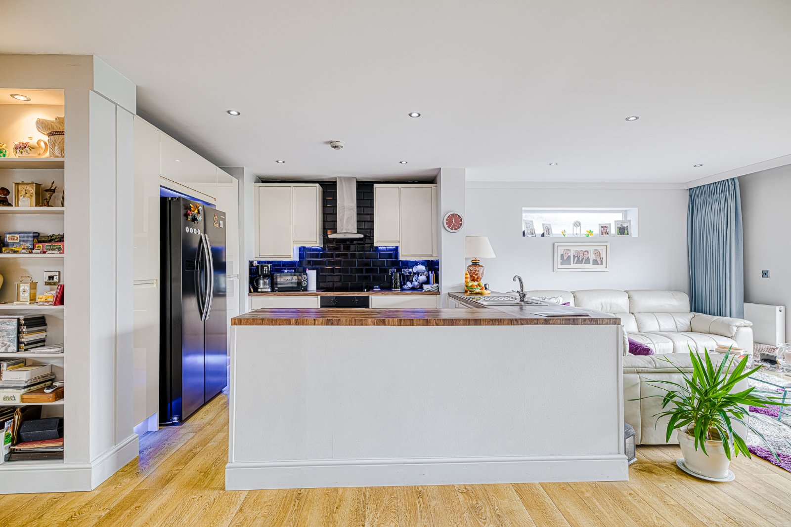 uPVC double glazed door to rear Garden with fanlight opener over. Laminate wood effect flooring. Four 'flat' skylights inset with smooth plastered ceiling inset with recess lighting.