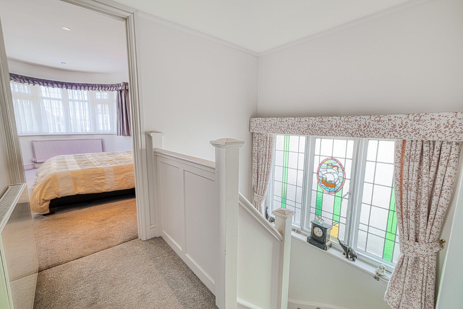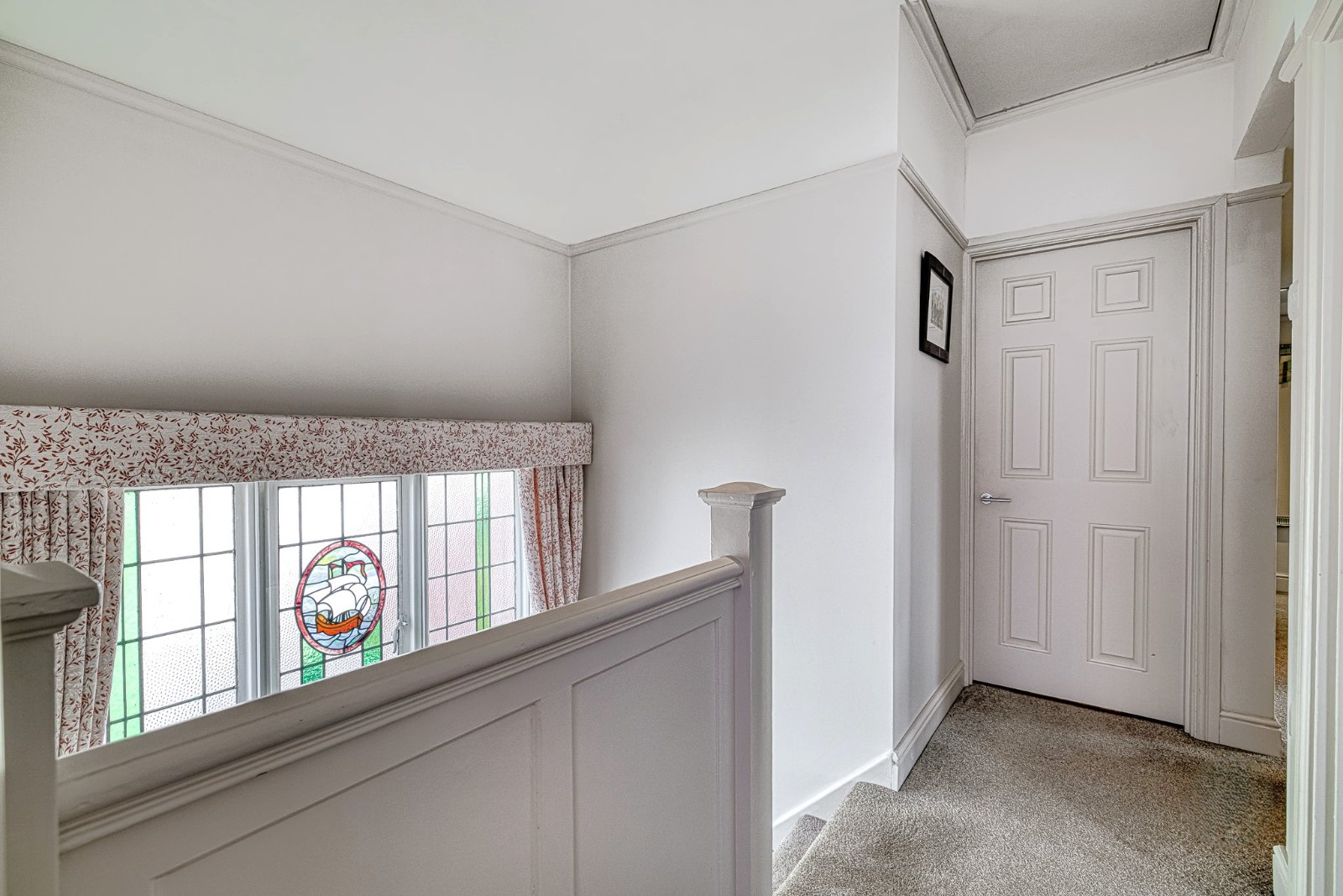 Large feature original obscure glazed leaded picture window to side aspect with secondary glazing. Panelled doors to all first floor rooms. Radiator. Picture rail. Cornice to smooth plastered ceiling with access to loft space.