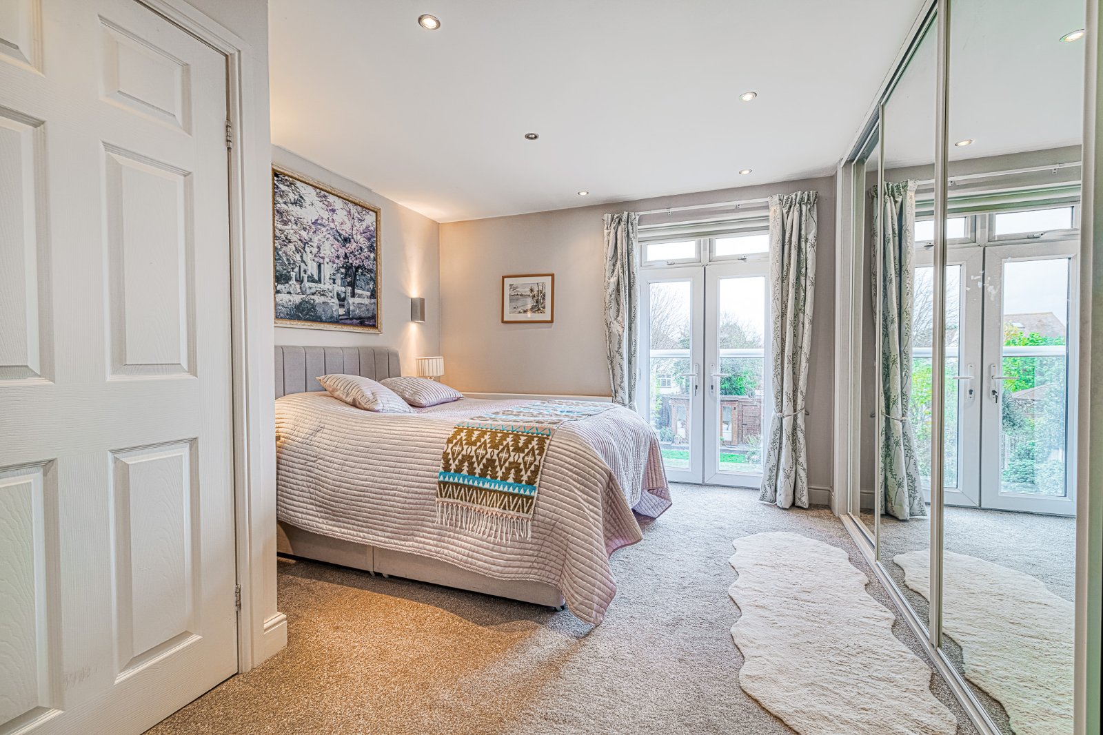 Pair of uPVC double glazed doors with fanlight openers, opening to Juliet style balcony. The bedroom is fitted with a range of floor to ceiling mirror fronted slide'a'robe wardrobe to one aspect. Radiator. Wall light points. Smooth plastered ceiling inset with recessed lighting. Pair of panelled doors open to;