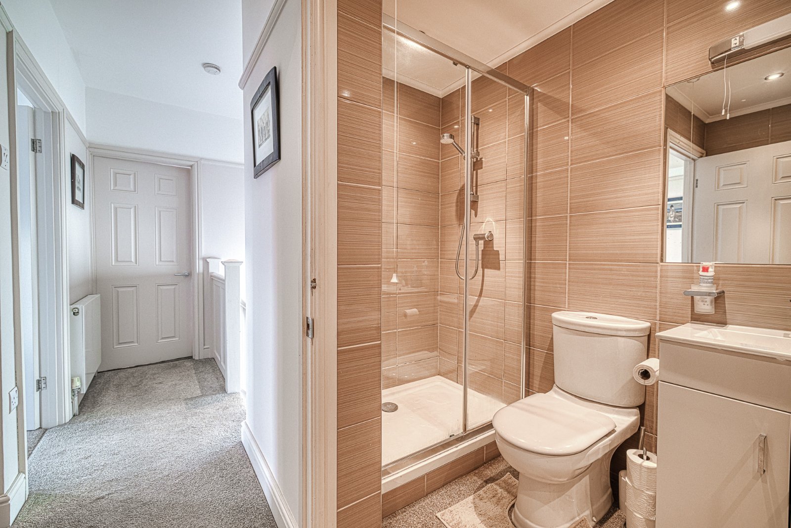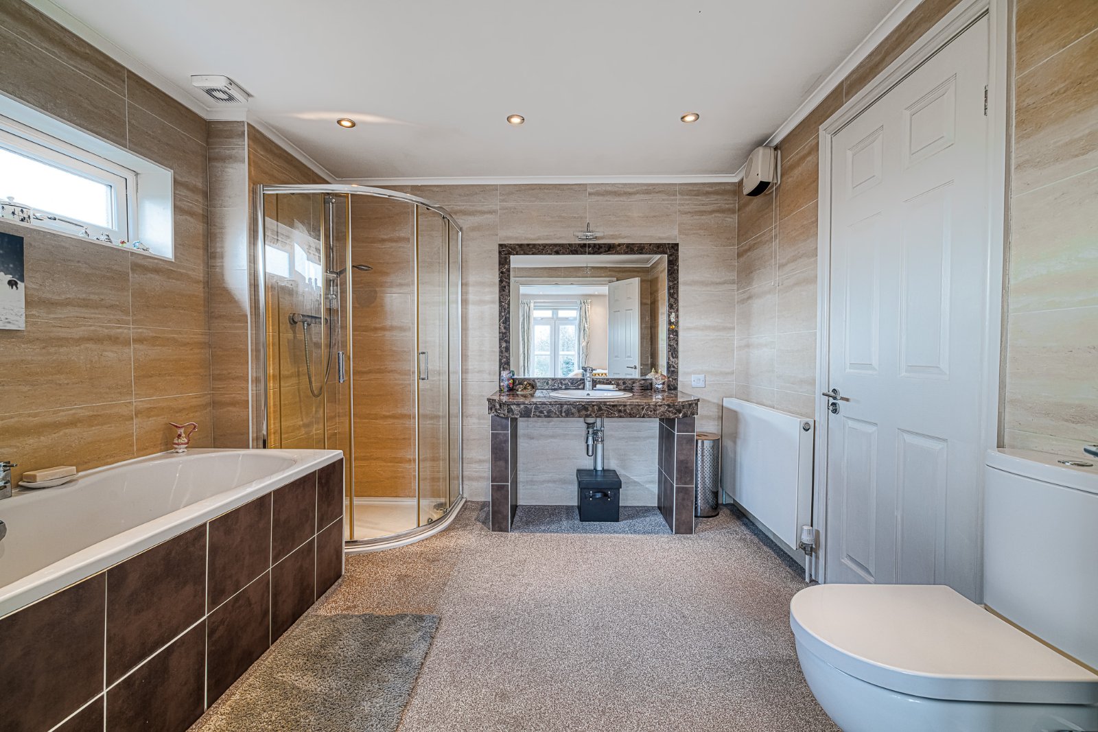 Panelled door providing access to Landing. High level obscure uPVC double glazed window to side aspect. The modern four piece suite comprises dual flush WC, independent tiled shower cubicle with integrates shower unit, tiled enclosed bath with central taps and vanity wash hand basin inset with large marble worksurfaces area with storage recess under. Wall mounted mirror and lighting. Tiling to all visible walls. Radiator. Smooth plastered ceiling inset with recessed lighting
