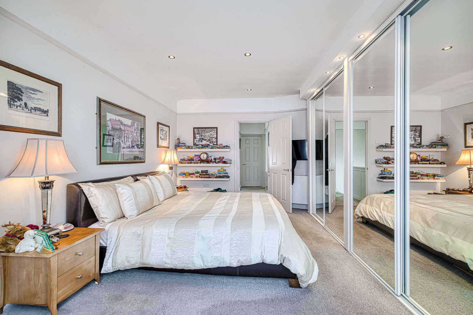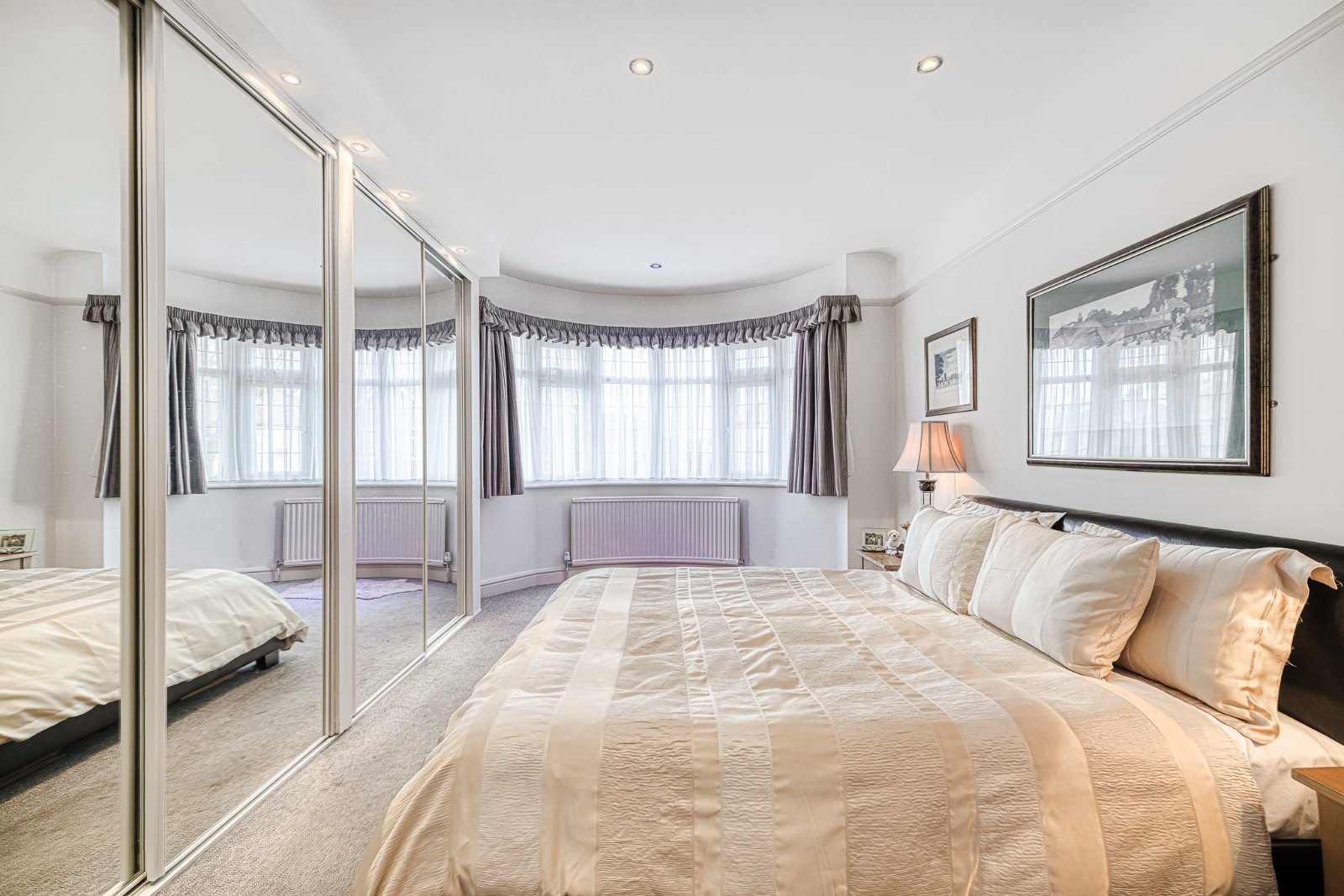 uPVC double glazed bay window to front aspect with leaded fan light openers with curved radiator under. The bedroom is fitted with a range of floor to ceiling mirror fronted slide'a'robe wardrobe with pelmet lighting over, to one aspect. Smooth plastered ceiling inset with recessed lighting.