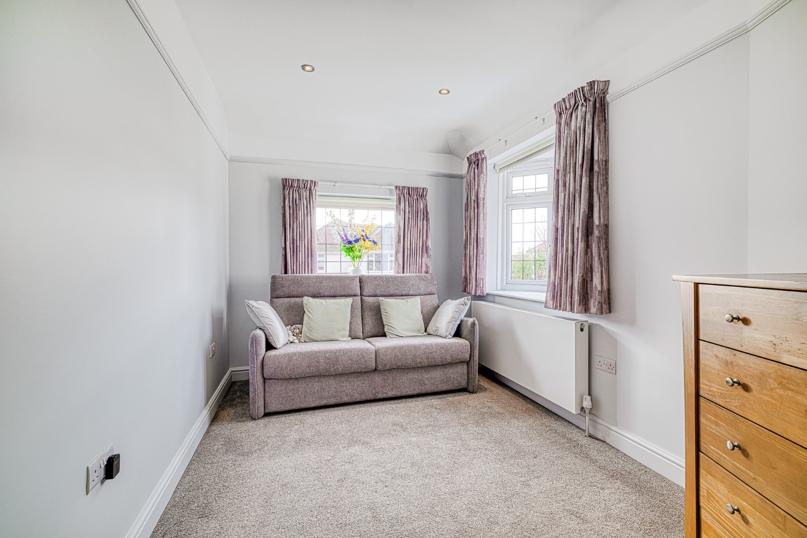 uPVC double glazed oriel style bay window to front aspect with further uPVC double glazed window to side aspect. Radiator. Smooth plastered ceiling inset with recessed lighting