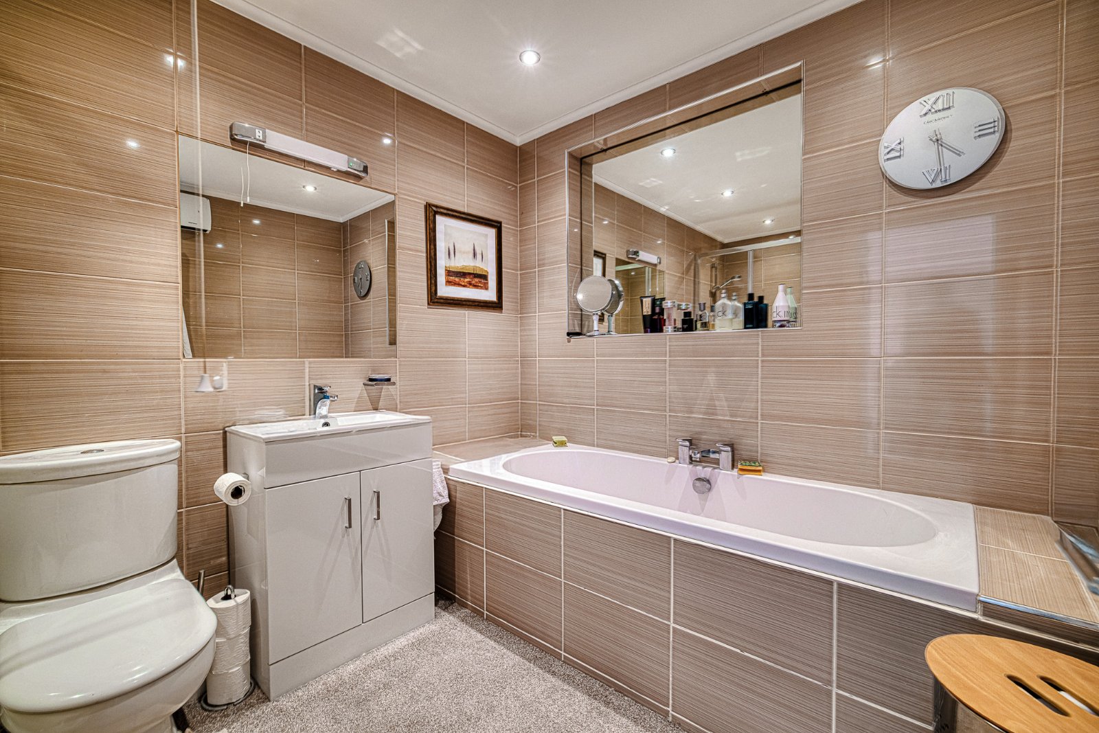 The modern white four piece suite comprises dual flush WC, independent double width tiled shower enclosure with integrated shower unit, tiled enclosed bath with central taps and vanity wash hand basin with mixer taps over and storage cupboards under. Recessed area inset with mirror. Tiling to all visible walls inset with additional vanity mirror over the wash hand basin. Over mirror lighting. Radiator. Coving to smooth plastered ceiling inset with recessed lighting