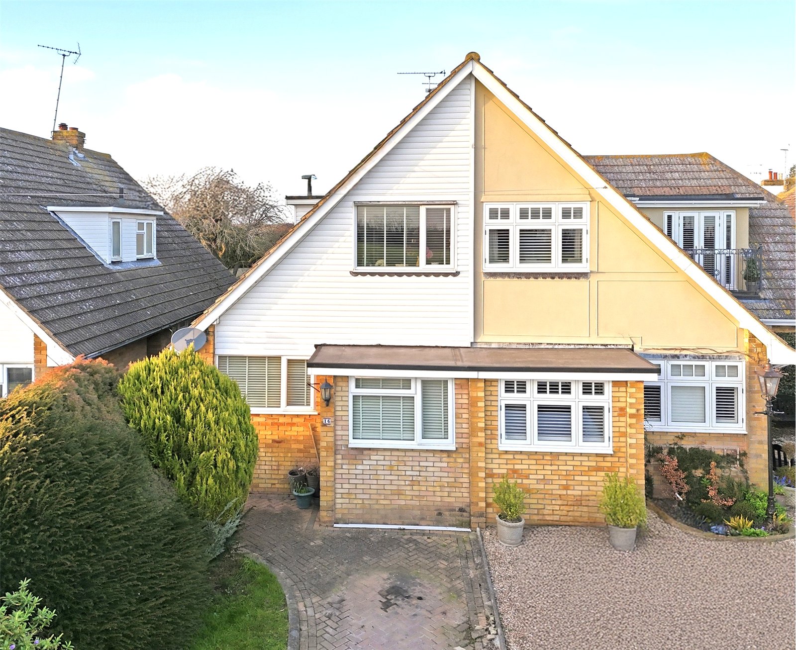 A lengthy herringbone brick block paviour private driveway offers parking space for two/three vehicles, with retained well planted and screened front garden, and footpath to side entrance