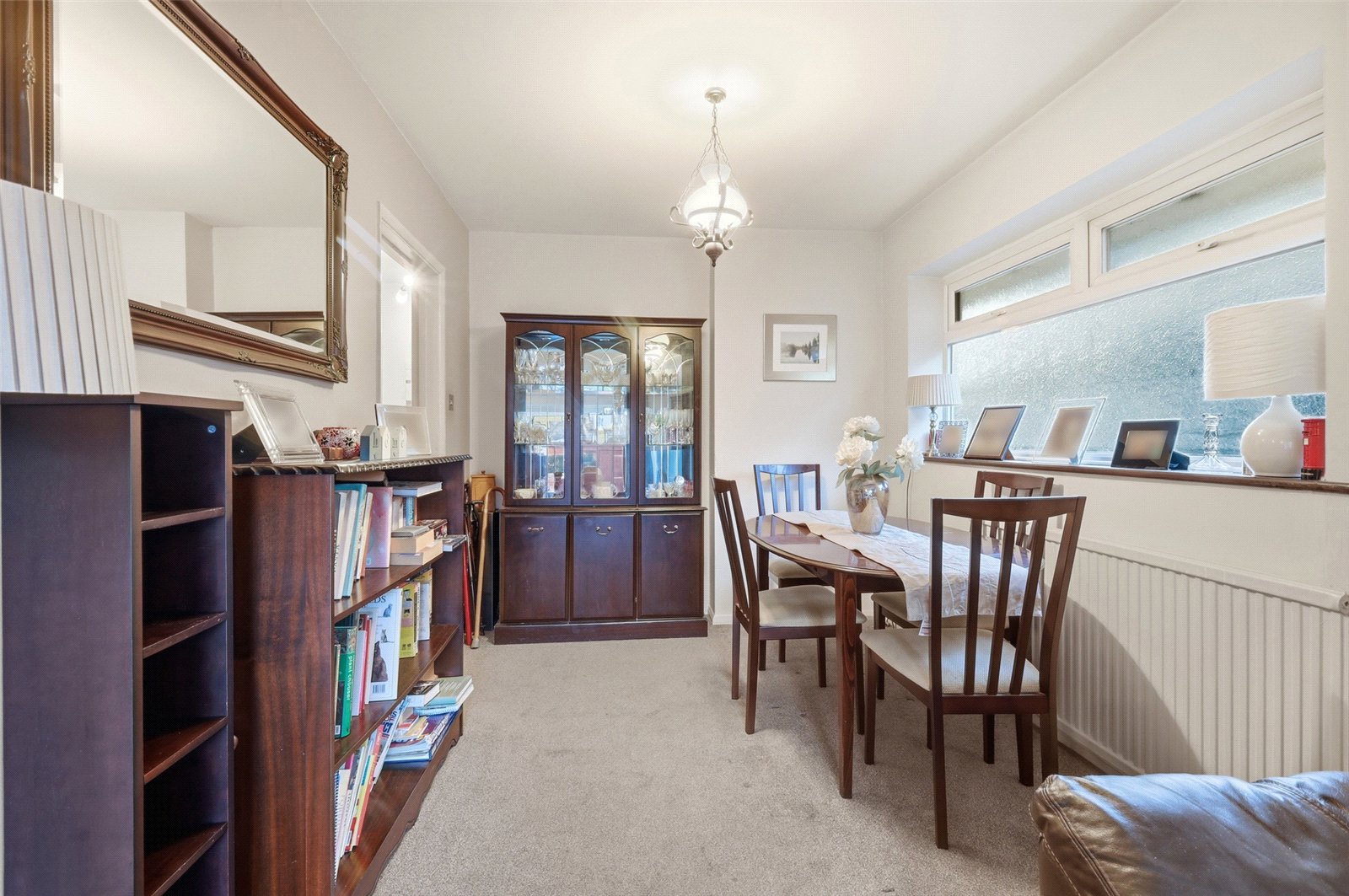 A spacious L-shaped room with double glazed patio doors giving access to the rear garden, and two obscure double glazed windows to side. Two radiators. Television aerial point. Polished hearth with coal effect gas fire (untested). Two wall light points. Smooth plastered ceiling. Service door to dining area.