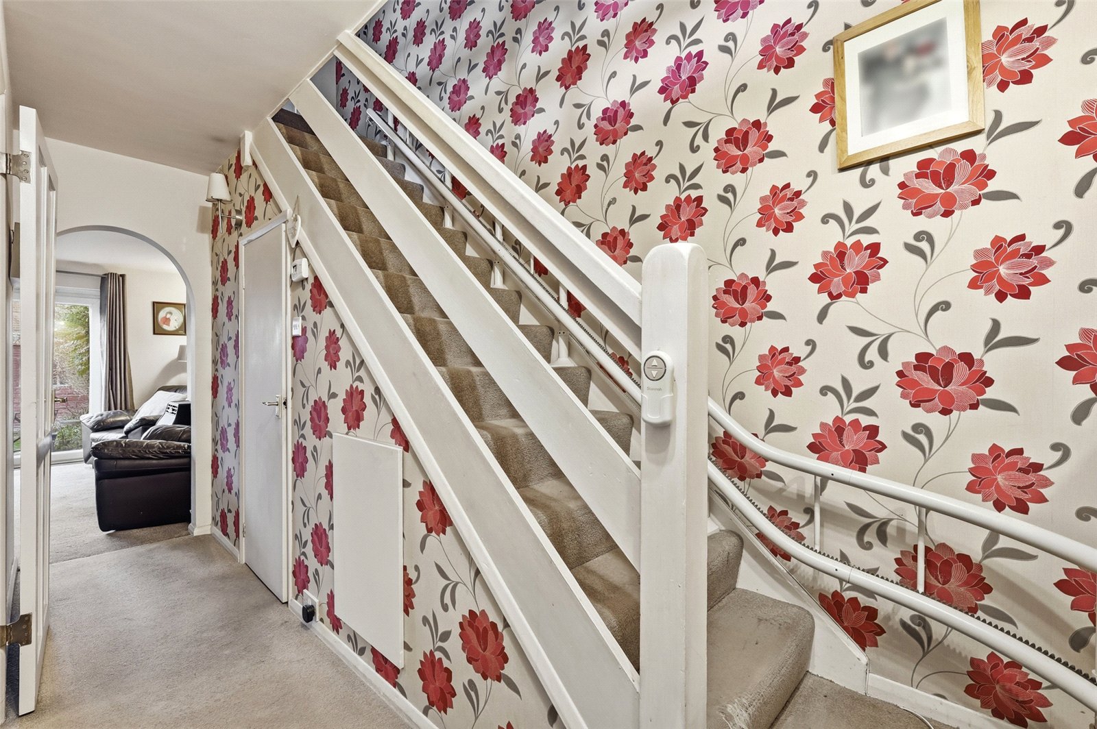Radiator. Access to understairs storage cupboard. Turned staircase to first floor landing. Wall light point. Smooth plastered ceiling. Doors lead off to: