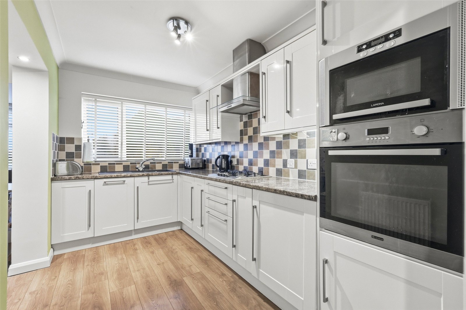 Oak effect flooring. Space, plumbing and drainage for automatic washing machine and further appliances, plus cloaks hanging space. Smooth plastered ceiling.