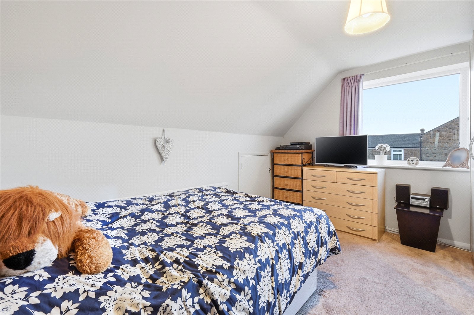 uPVC double glazed window to rear. Radiator. Access to eaves storage area. Smooth plastered part vaulted ceiling.