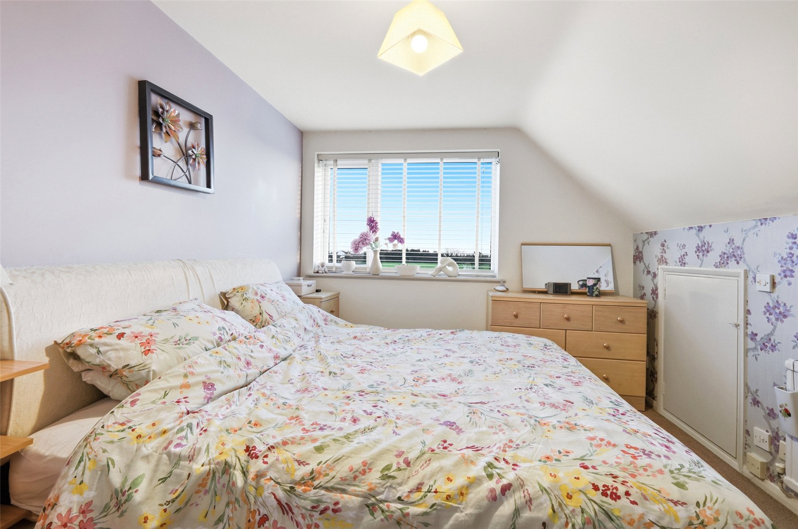 uPVC double glazed window to front with far reaching views across open farmland. Access to eaves storage area. Radiator. Smooth plastered part vaulted ceiling.