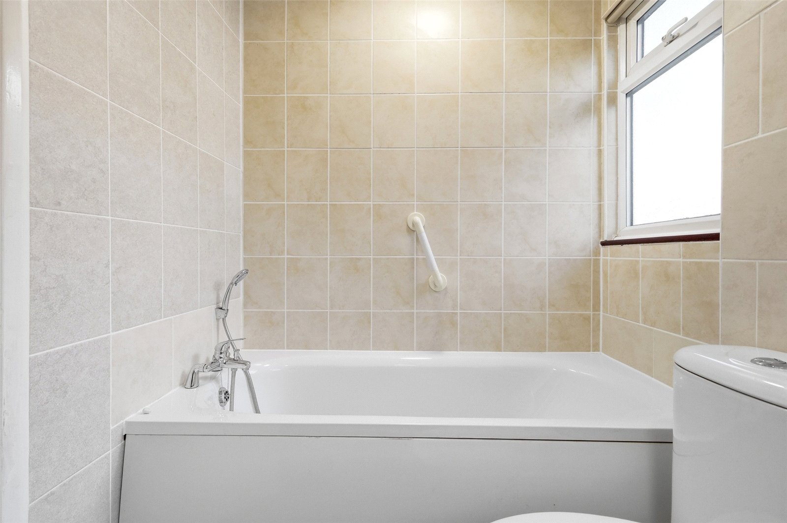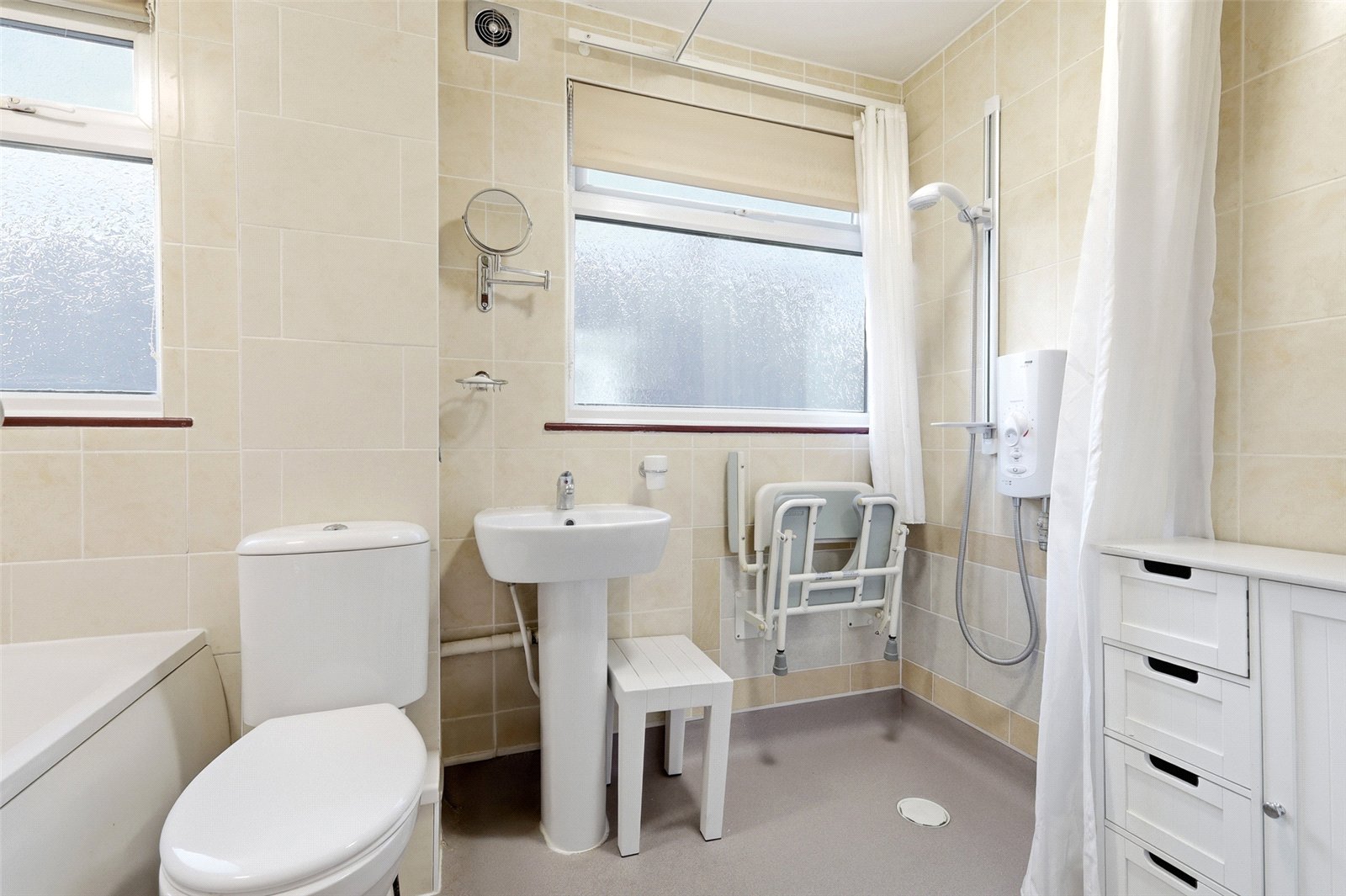 Obscure uPVC double glazed windows to side. A spacious family bathroom fitted with a four piece suite comprising panel-enclosed bath with telephone mixer tap and shower attachment, dual flush close coupled WC, pedestal wash handbasin, and wet room style shower enclosure with Mira Advance electric shower. Radiator. Full ceramic tiling to all walls. Extractor fan. Smooth plastered ceiling. Drop light switch.