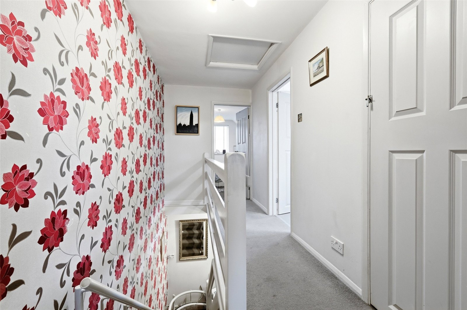 Galleried landing with access to insulated roof space. Access to large boiler cupboard housing Veissmann condensing gas boiler serving domestic hot water and central heating system, with ample additional linen storage space. Smooth plastered ceiling. Doors lead off to first floor rooms.