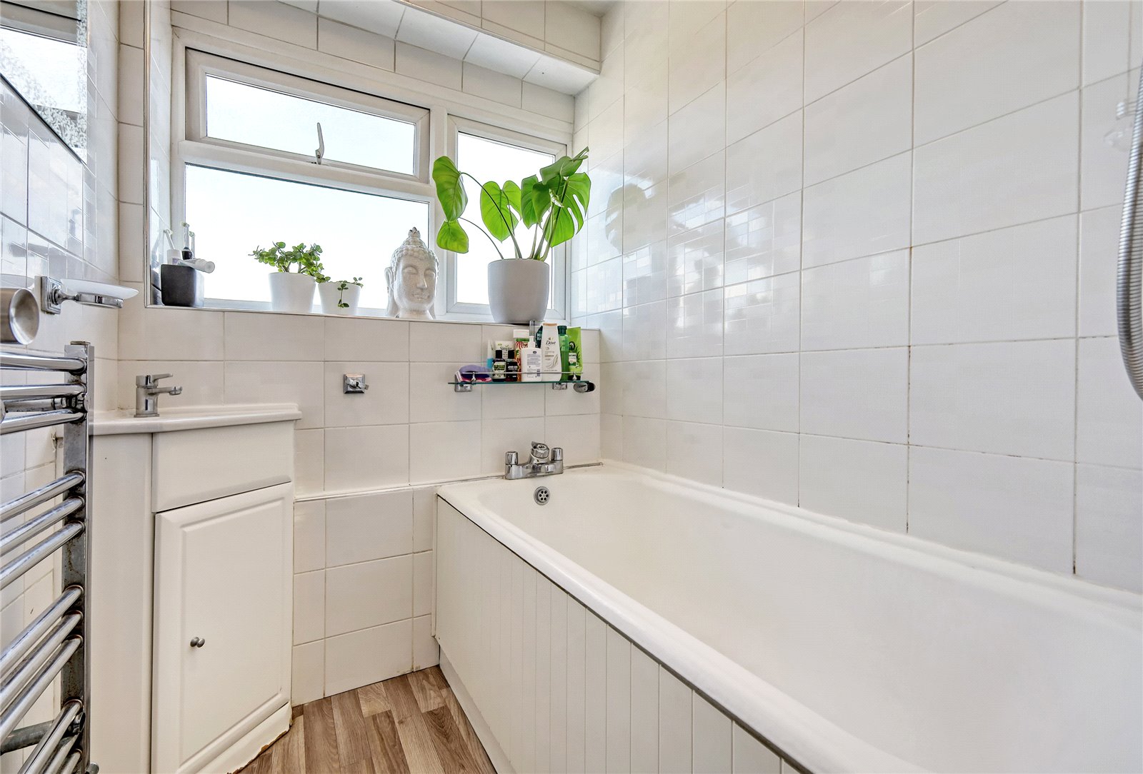 Obscure uPVC double glazed window to rear. Fitted with a two piece suite comprising panel enclosed bath with independent shower above and mixer tap, and corner wash handbasin with vanity storage cupboard beneath. Heated towel rail. Vinyl flooring. Full ceramic tiling in white to all walls. Drop light switch.