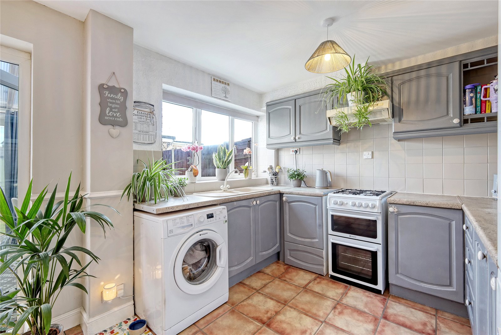 uPVC double glazed French doors give access to the conservatory, and uPVC double glazed window to rear. The kitchen is fitted with a range of base and pelmeted eye level cabinets with rolled edged working surfaces and inset one and a quarter bowl polycarbonate sink unit with mixer tap. Space and supply for gas/electric cooker. Space for upright fridge/freezer. Space, plumbing and drainage for automatic washing machine. Tiled effect laminate wooden flooring. Access to large understairs storage cupboard. Dado rail. Smooth plastered ceiling.