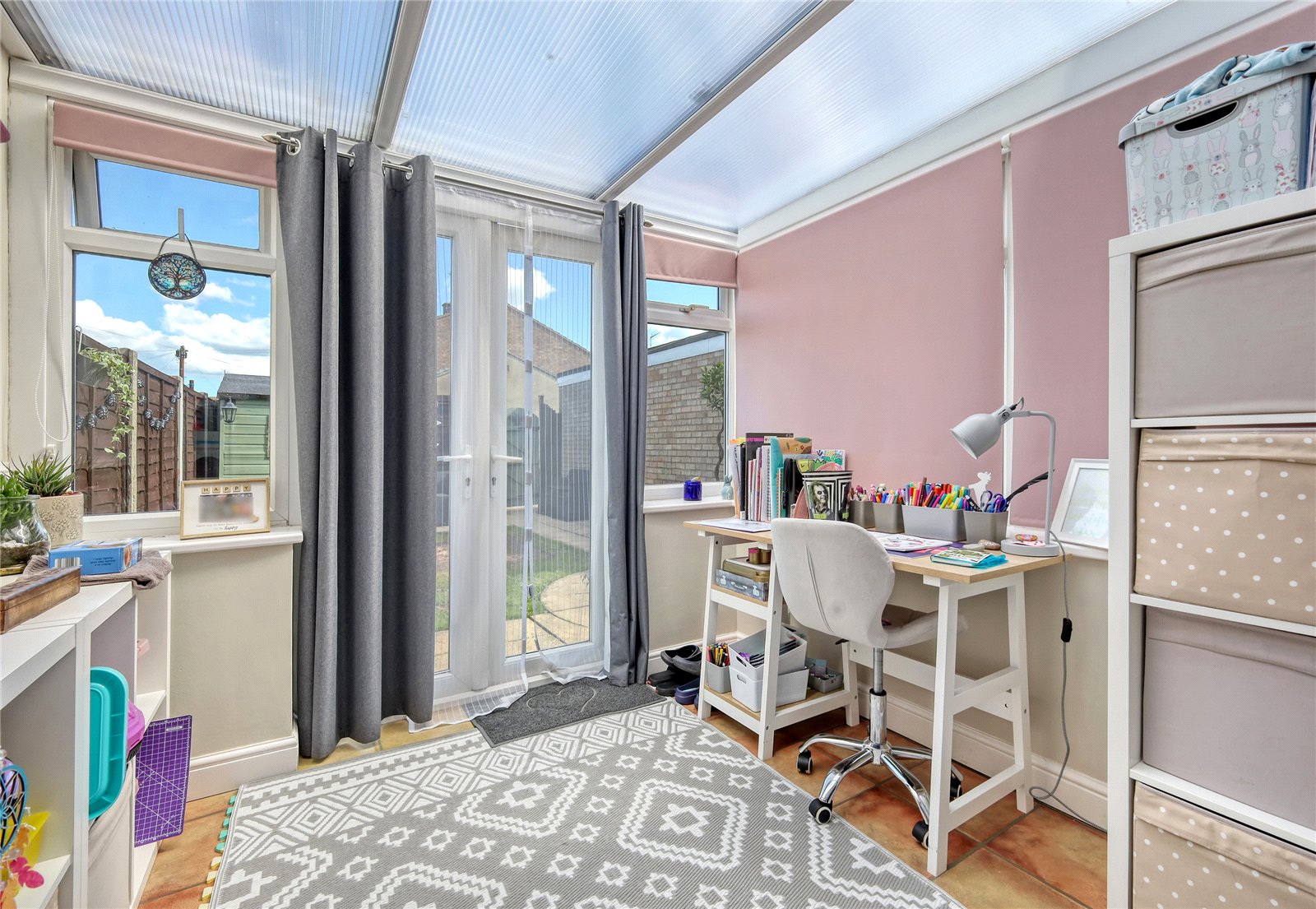 uPVC double glazed French doors give access to the rear garden, and uPVC double glazed windows to side and rear. Perspex triplex 'reflectorlite' roof. Two wall light points. Tiled effect laminate flooring.