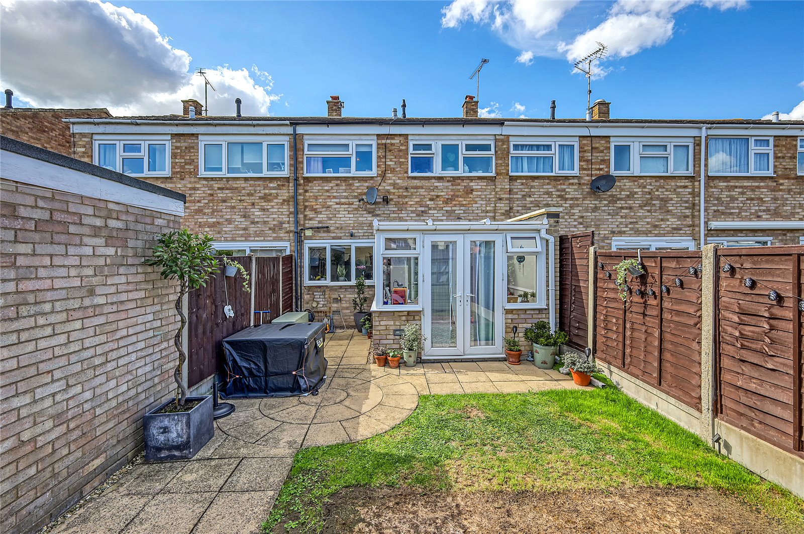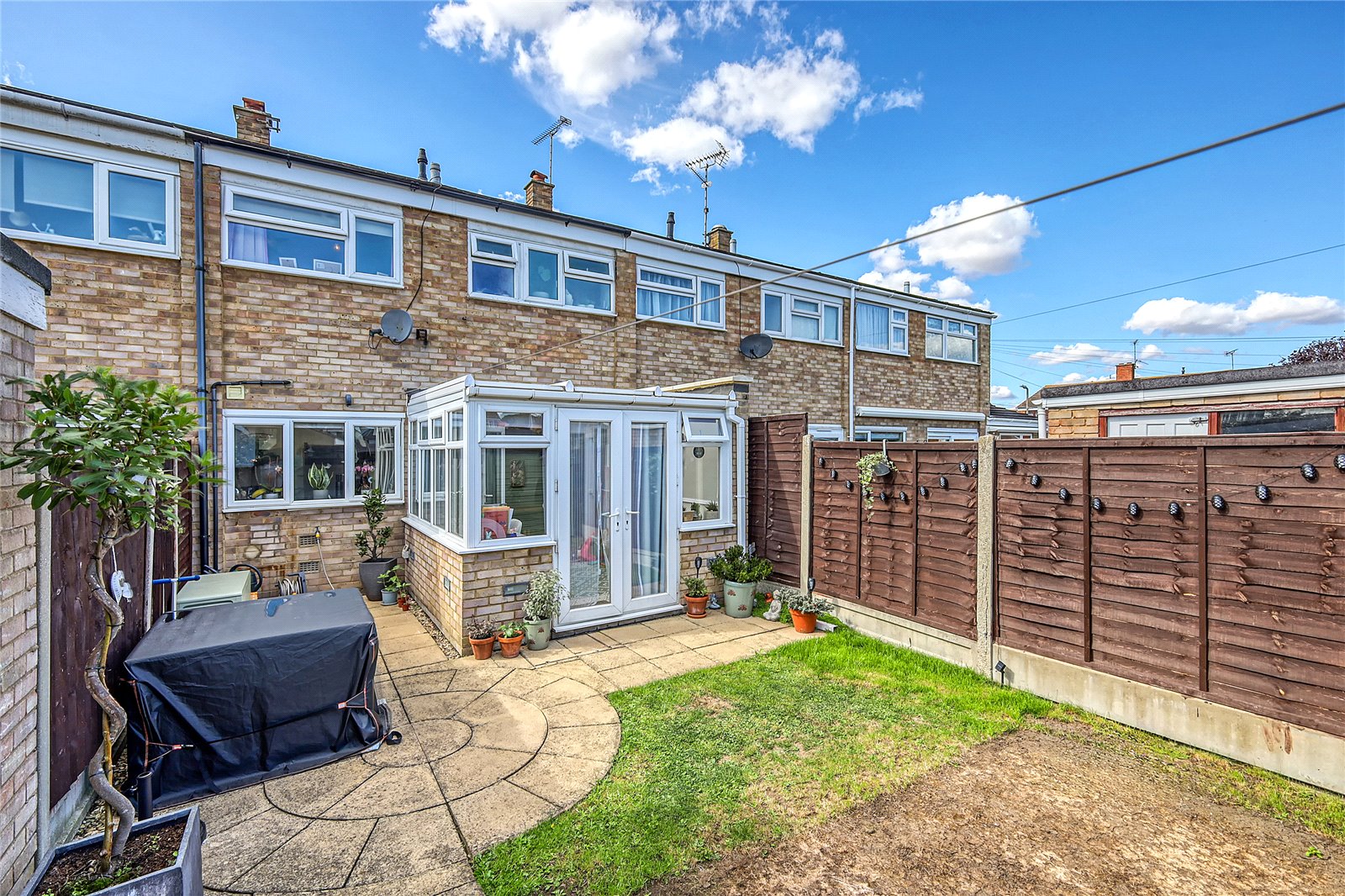 Central lawned area, fenced to both sides and rear boundary, coloured paved patio terrace with circular feature, secure gated rear access.
