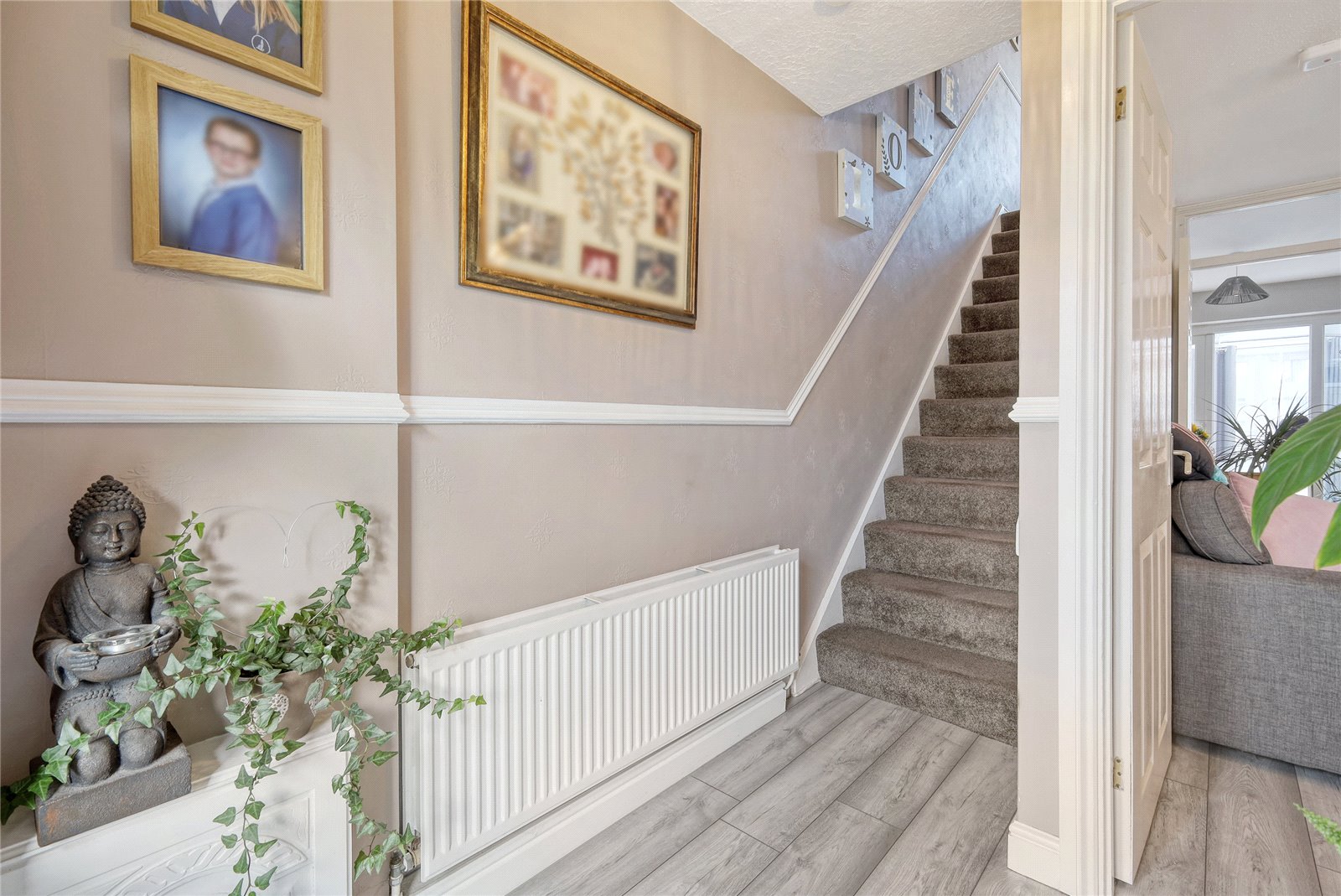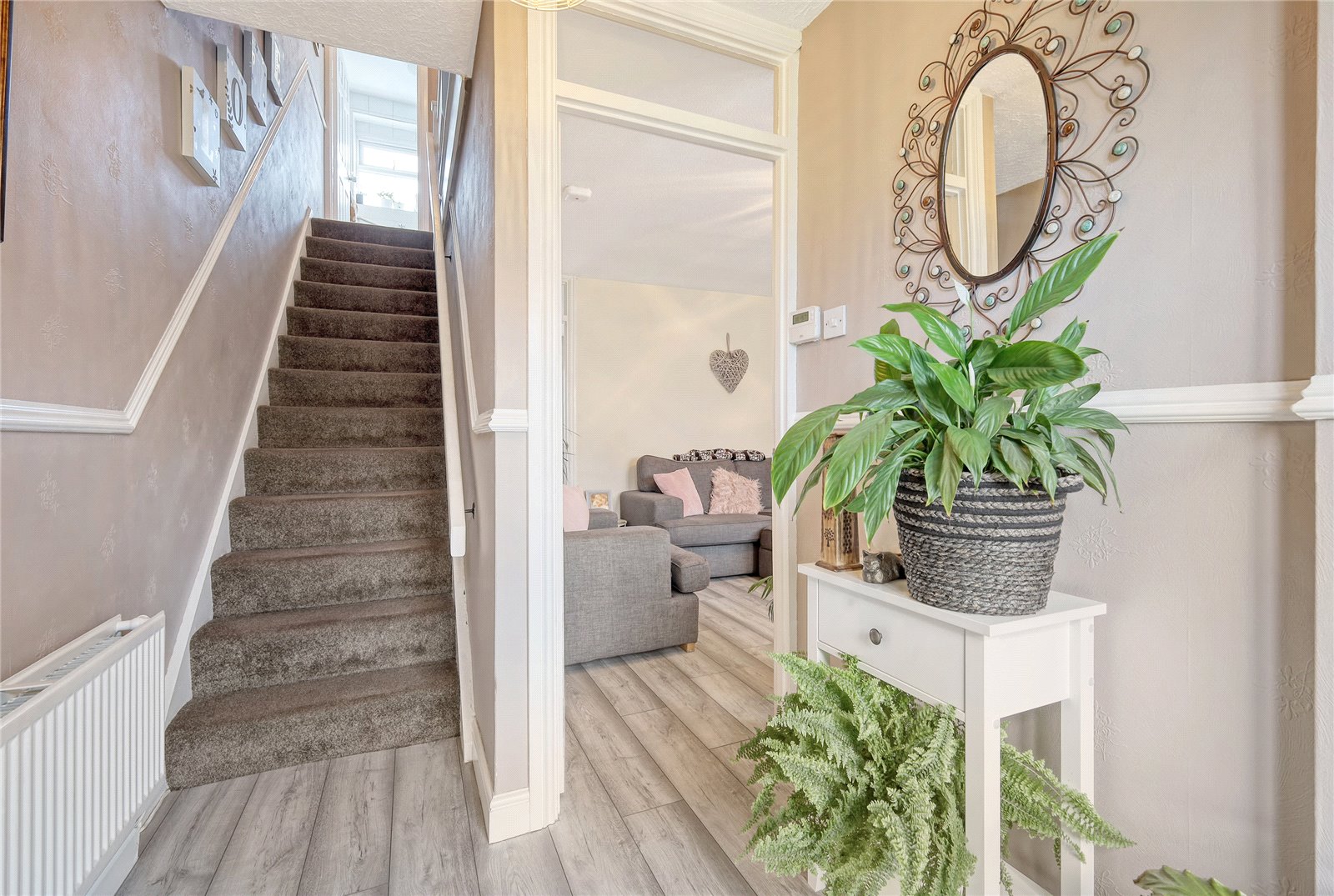Oak effect flooring. Double banked radiator. Staircase to first floor landing. Dado rail. Cloaks hanging space. Wall mounted central heating thermostat and control. A six panel door leads through to: