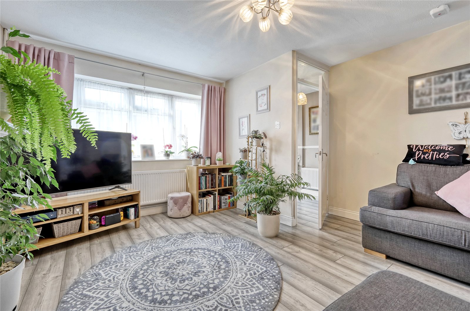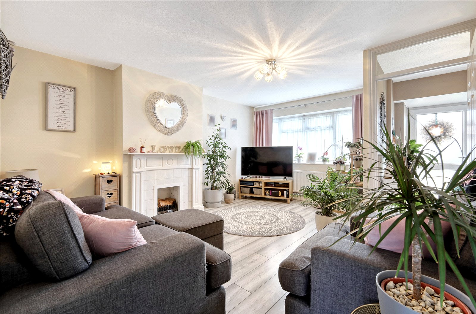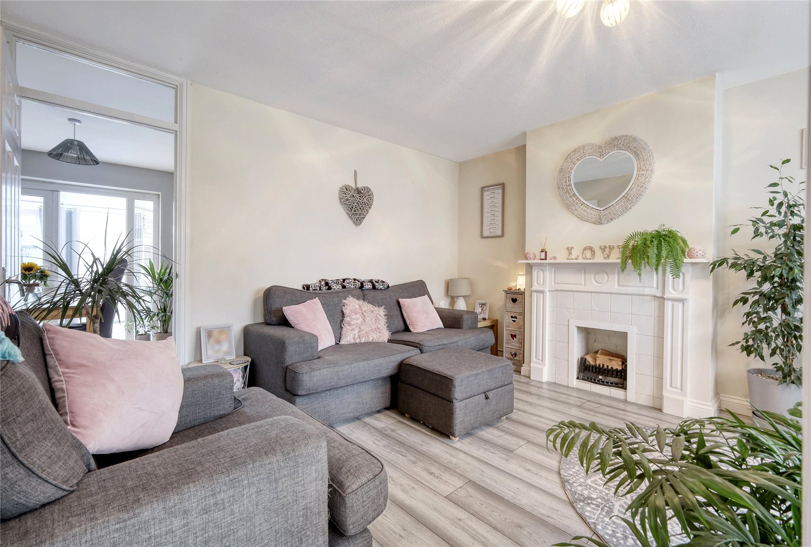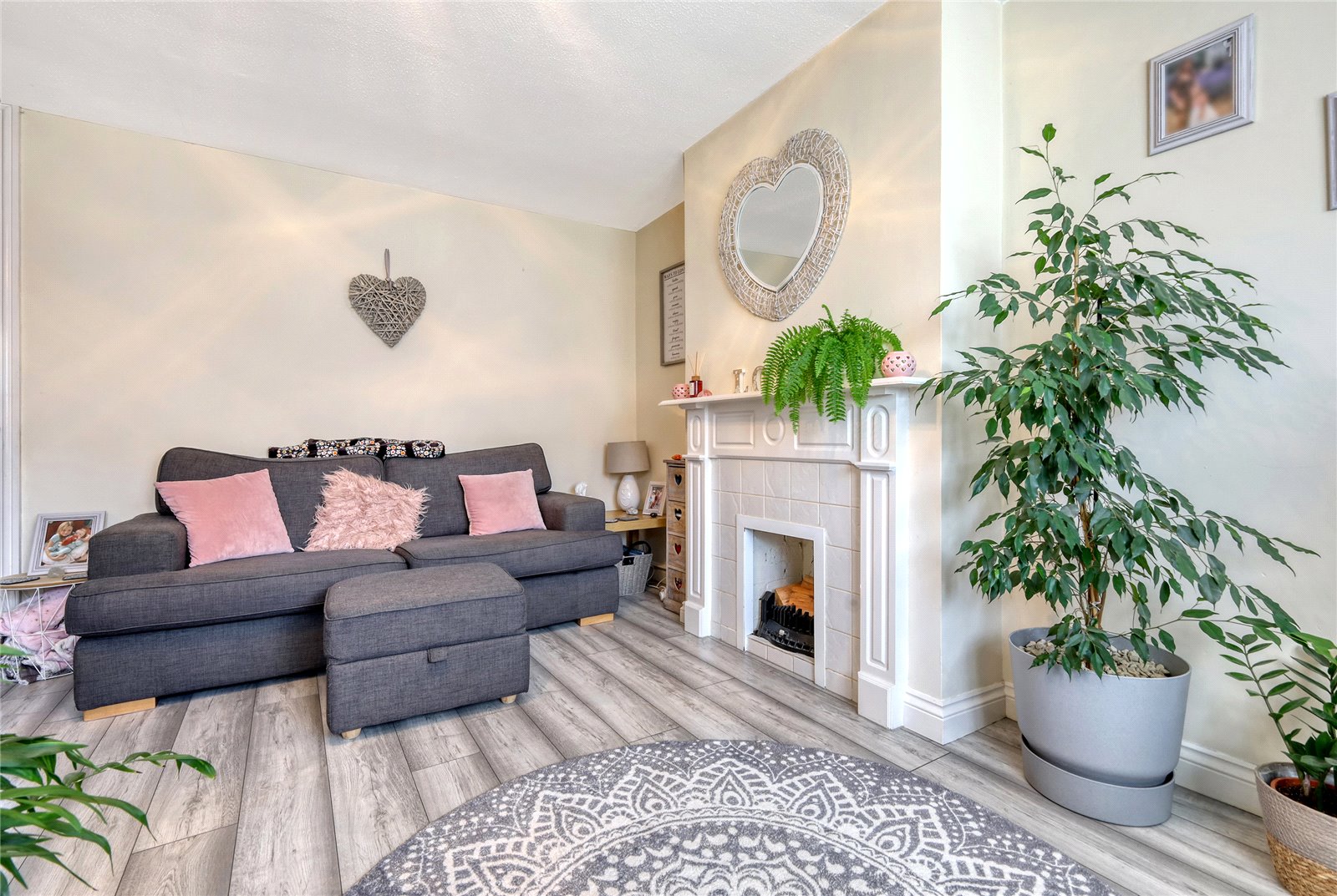 uPVC double glazed window to front. Radiator. Oak effect flooring. Feature fireplace with open flue and tiled surround. Television aerial point. A six-panel door leads through to: